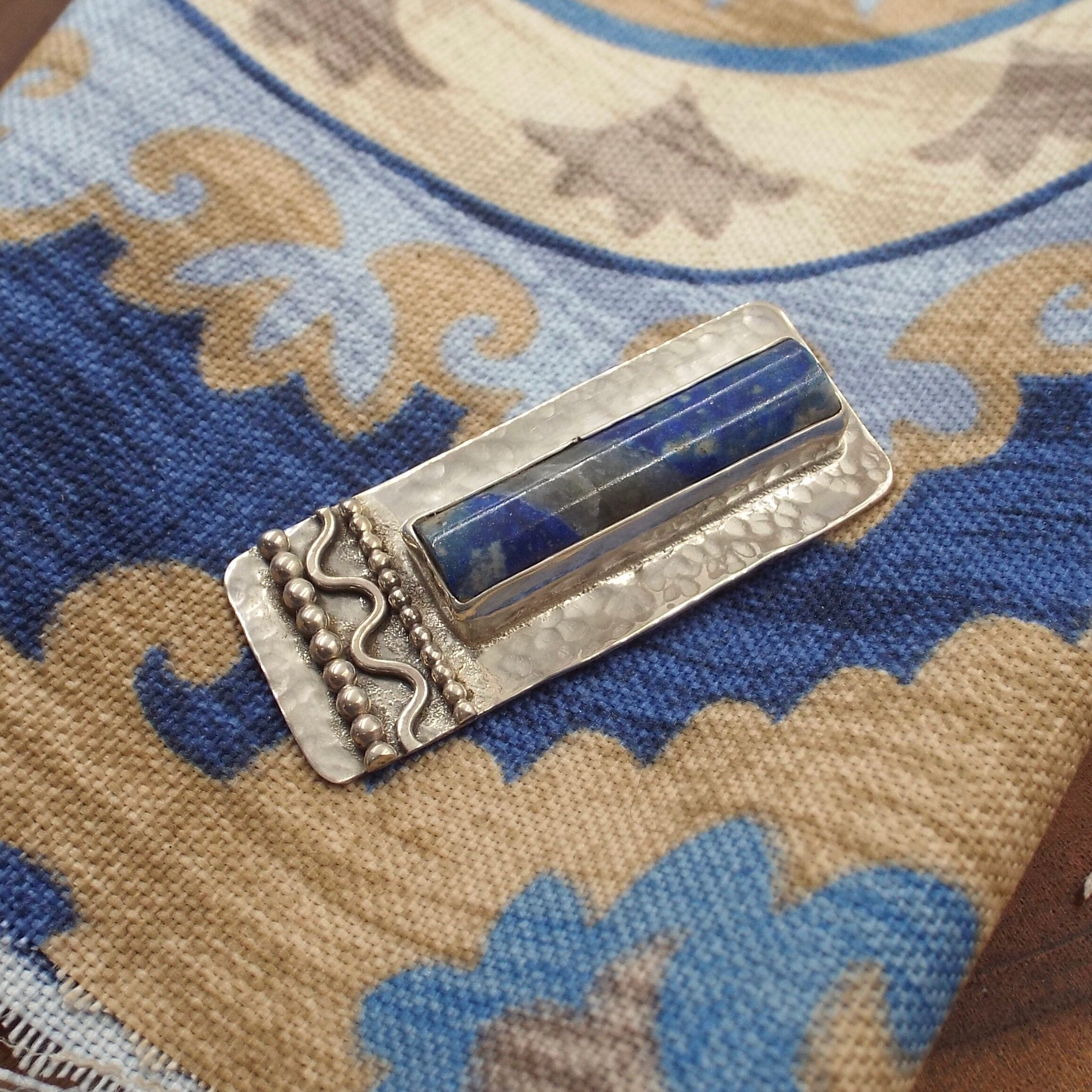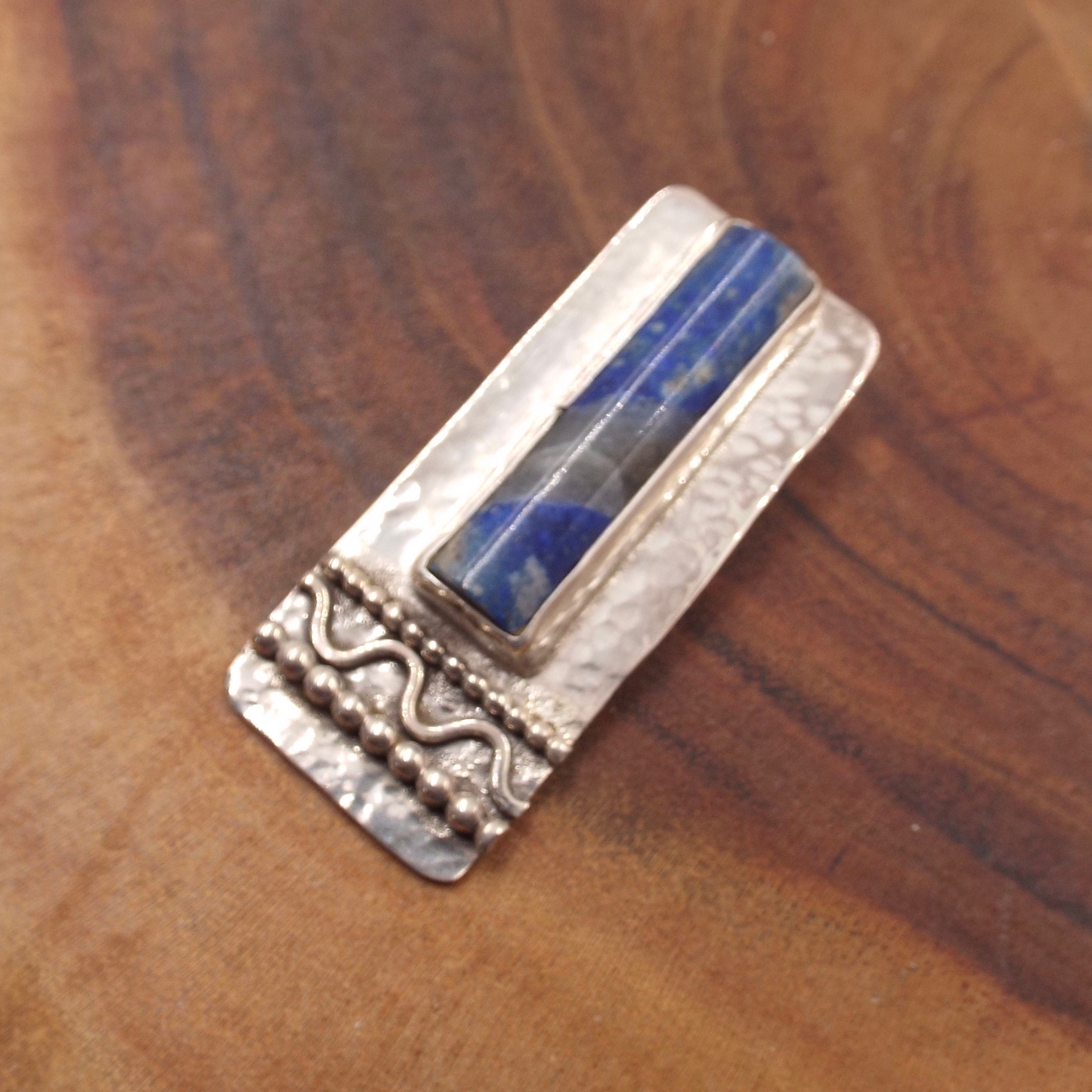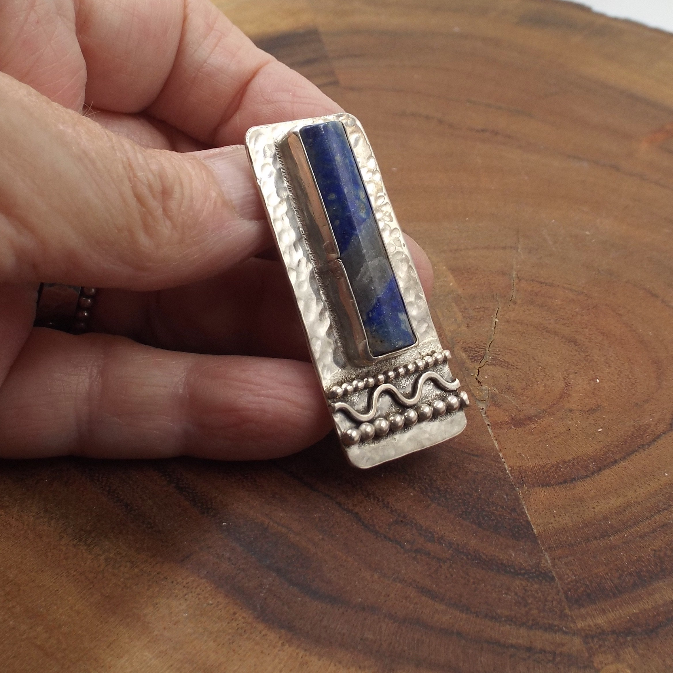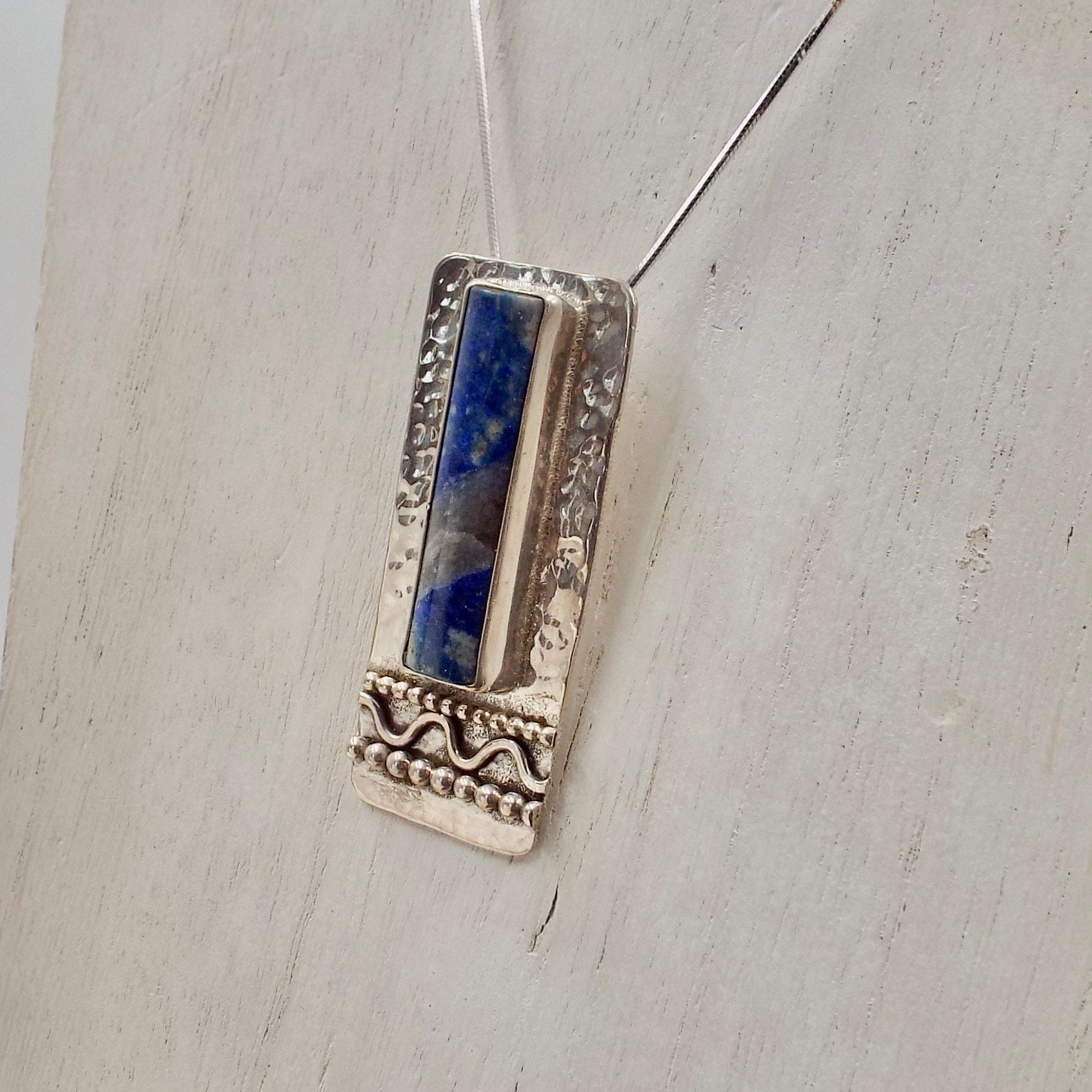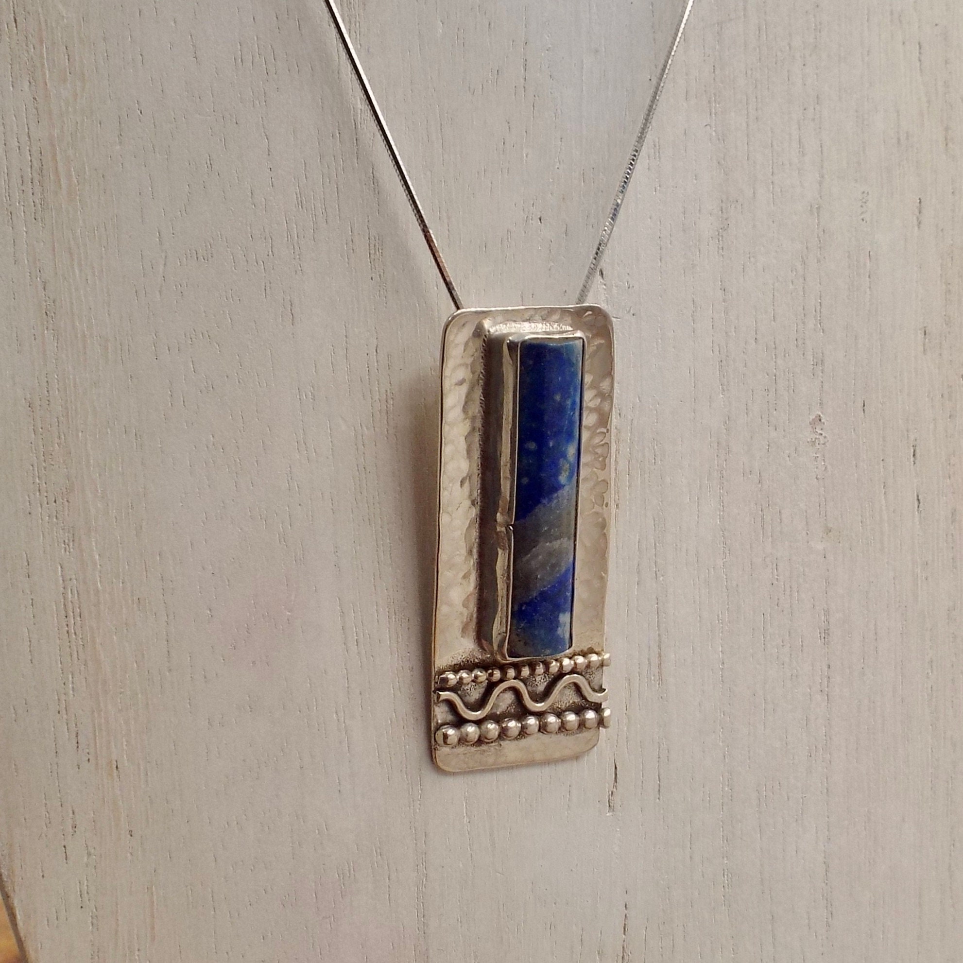 This denim lapis pendant features a classic hammered finish. Bead wires and a wavy wire complete the piece.