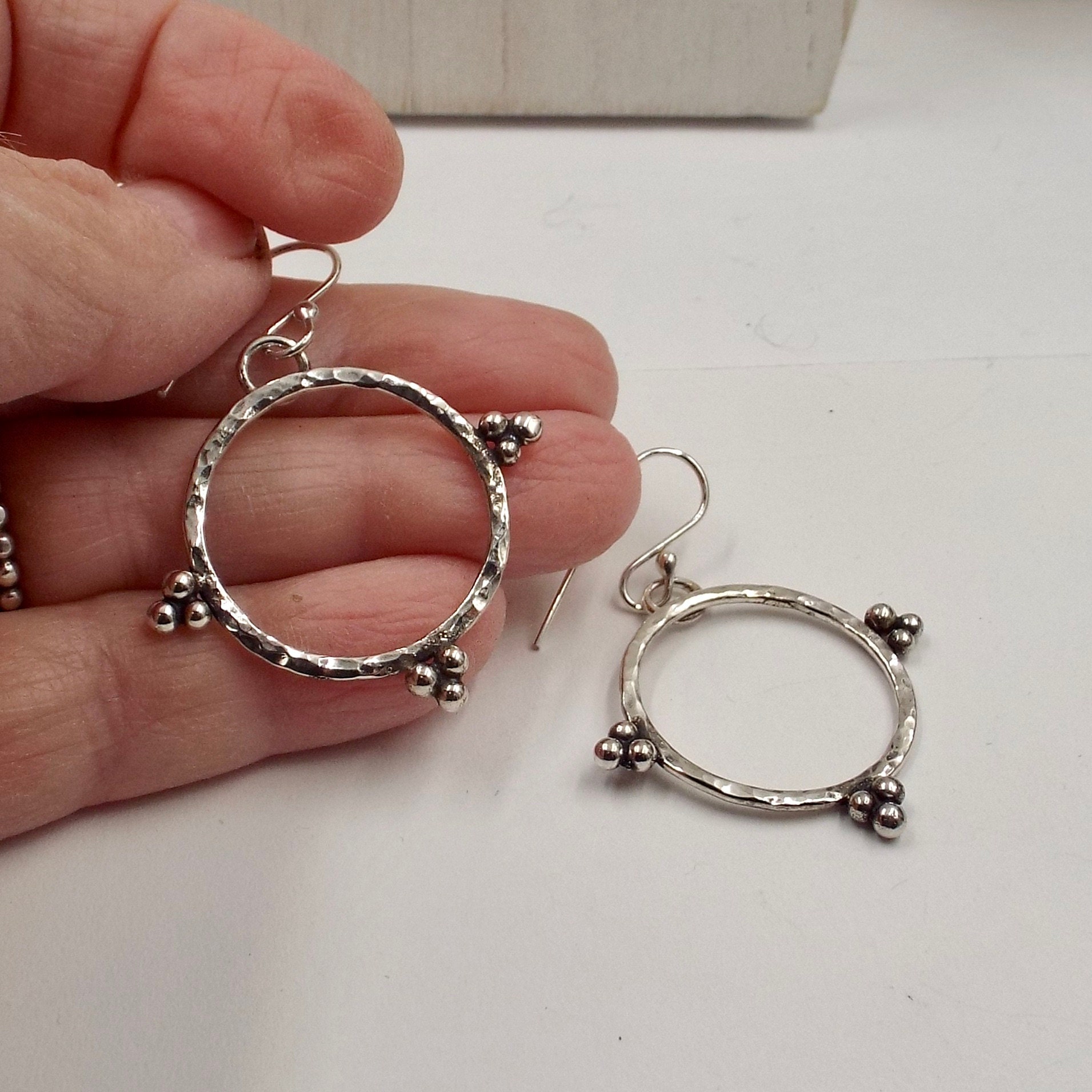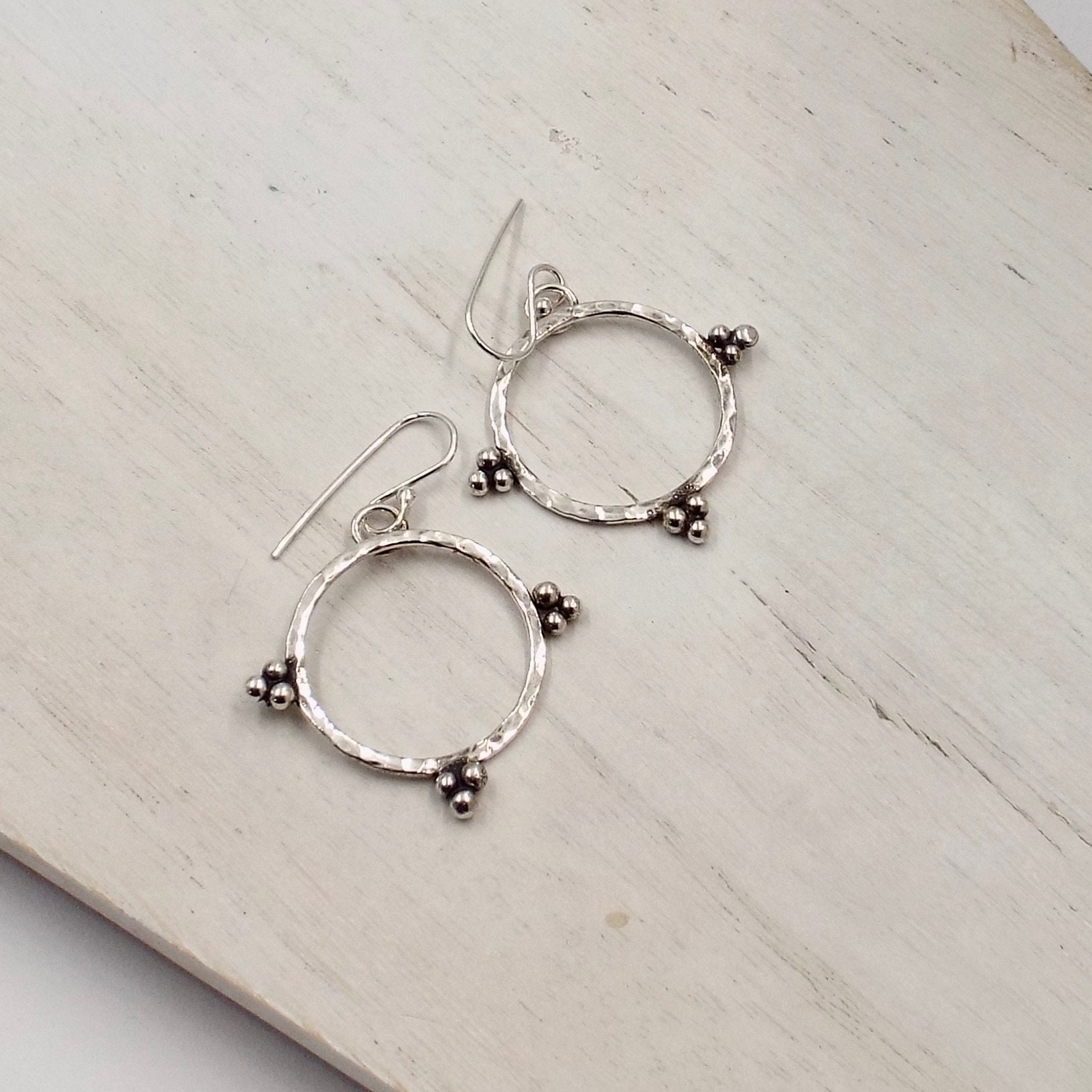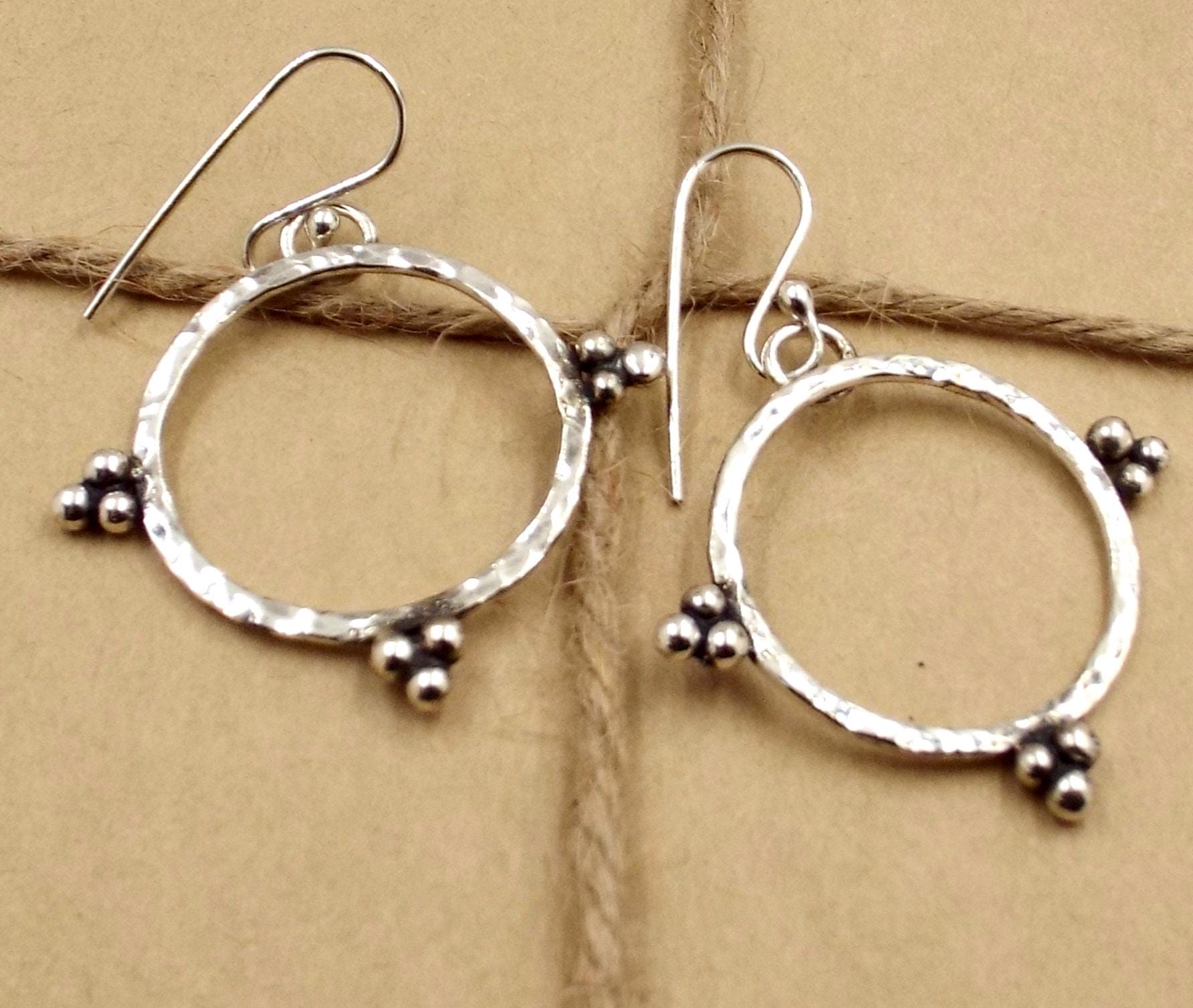 These hoop earrings feature a hammered metal texture and are accented with clusters of silver balls. These earrings are earthy yet elegant.