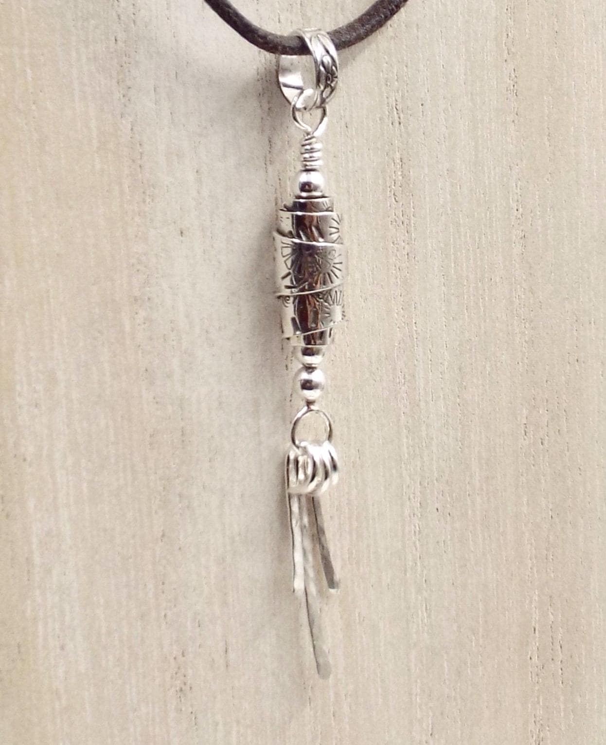 This pendant is made from stamped silver than is rolled into a "crescent roll" bundle. It is embellished with shiny silver beads and hammered sterling dangles.