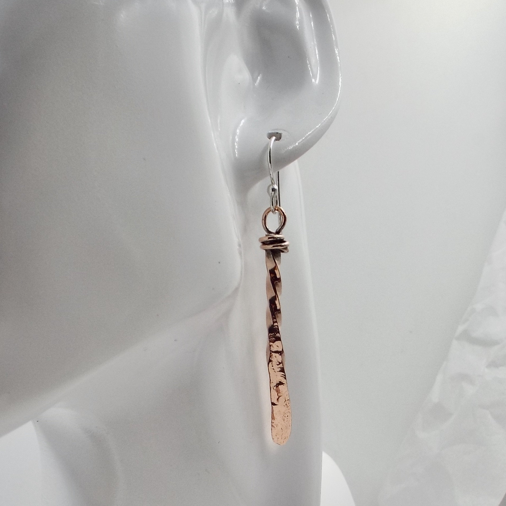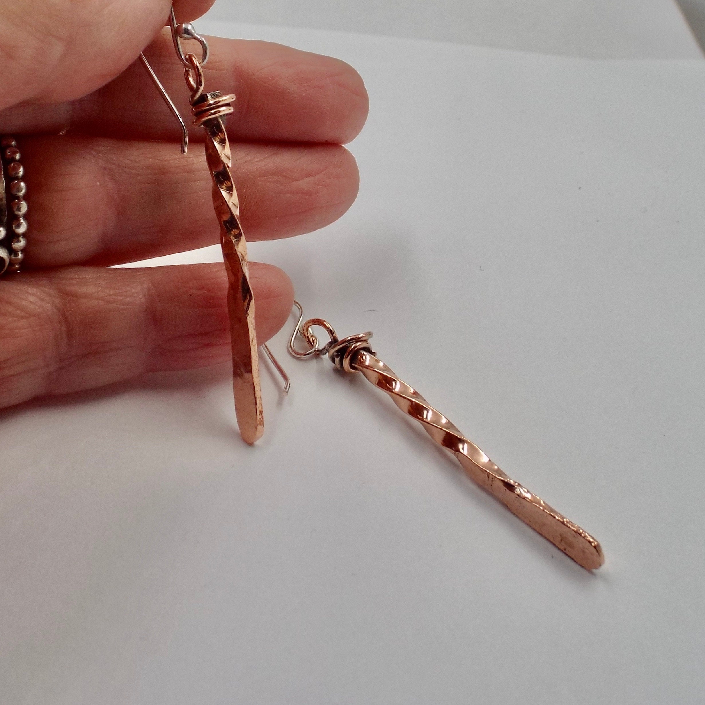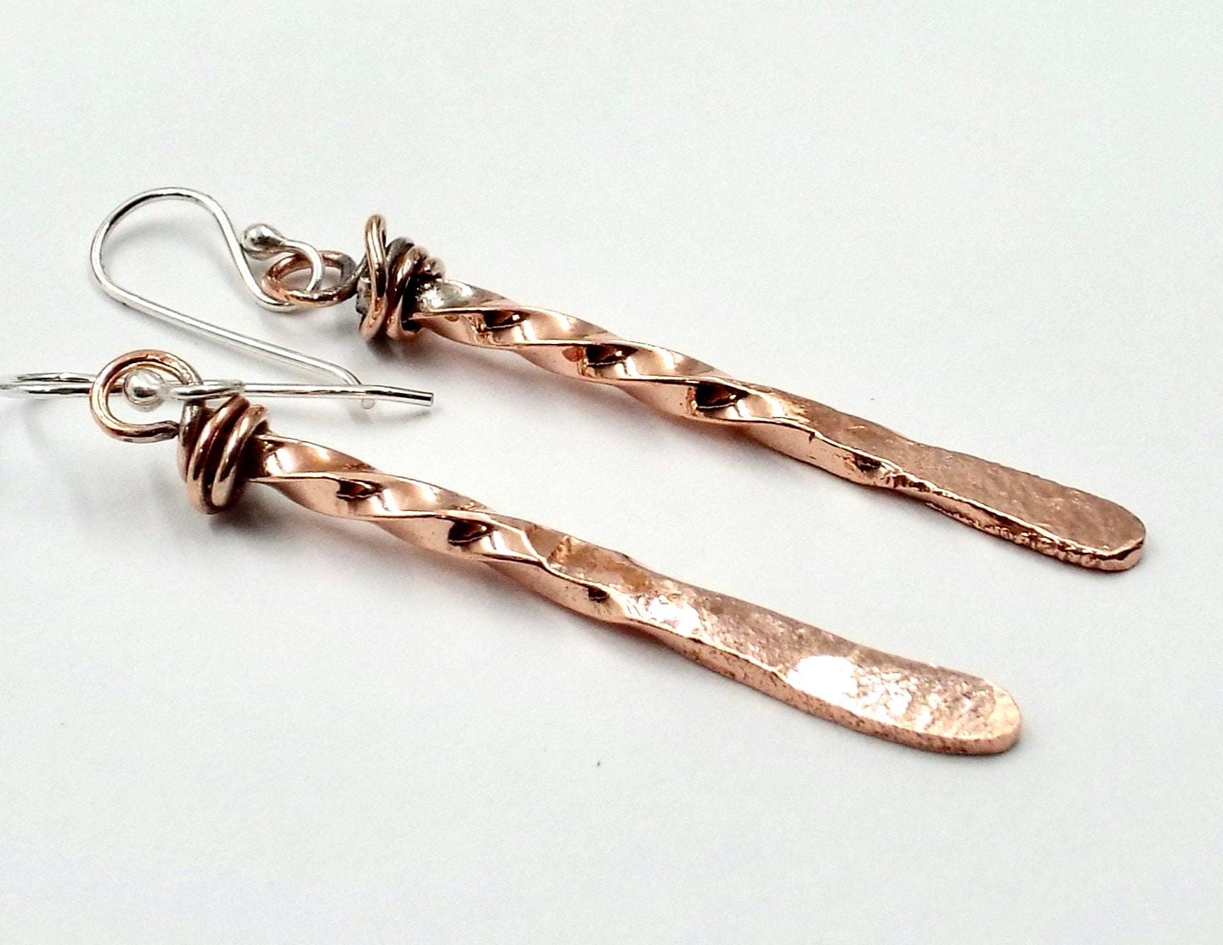 They are made from 10 gauge square copper wires that have been twisted, hammered and polished.