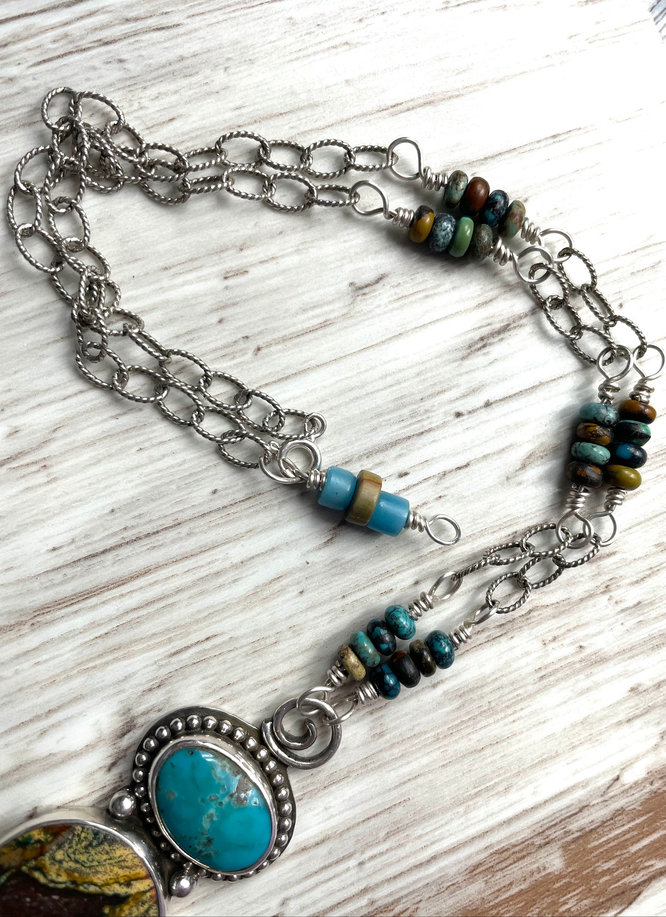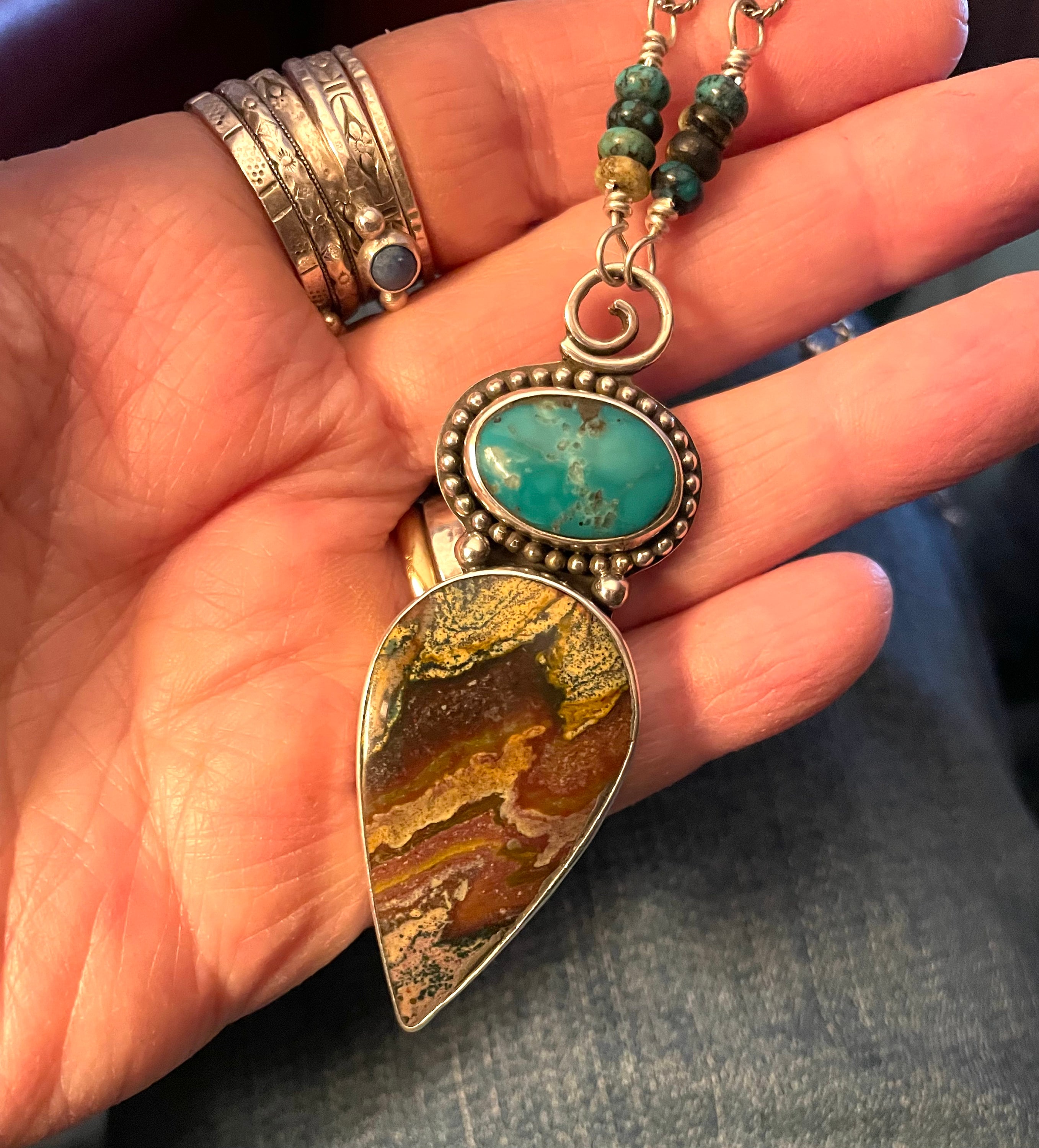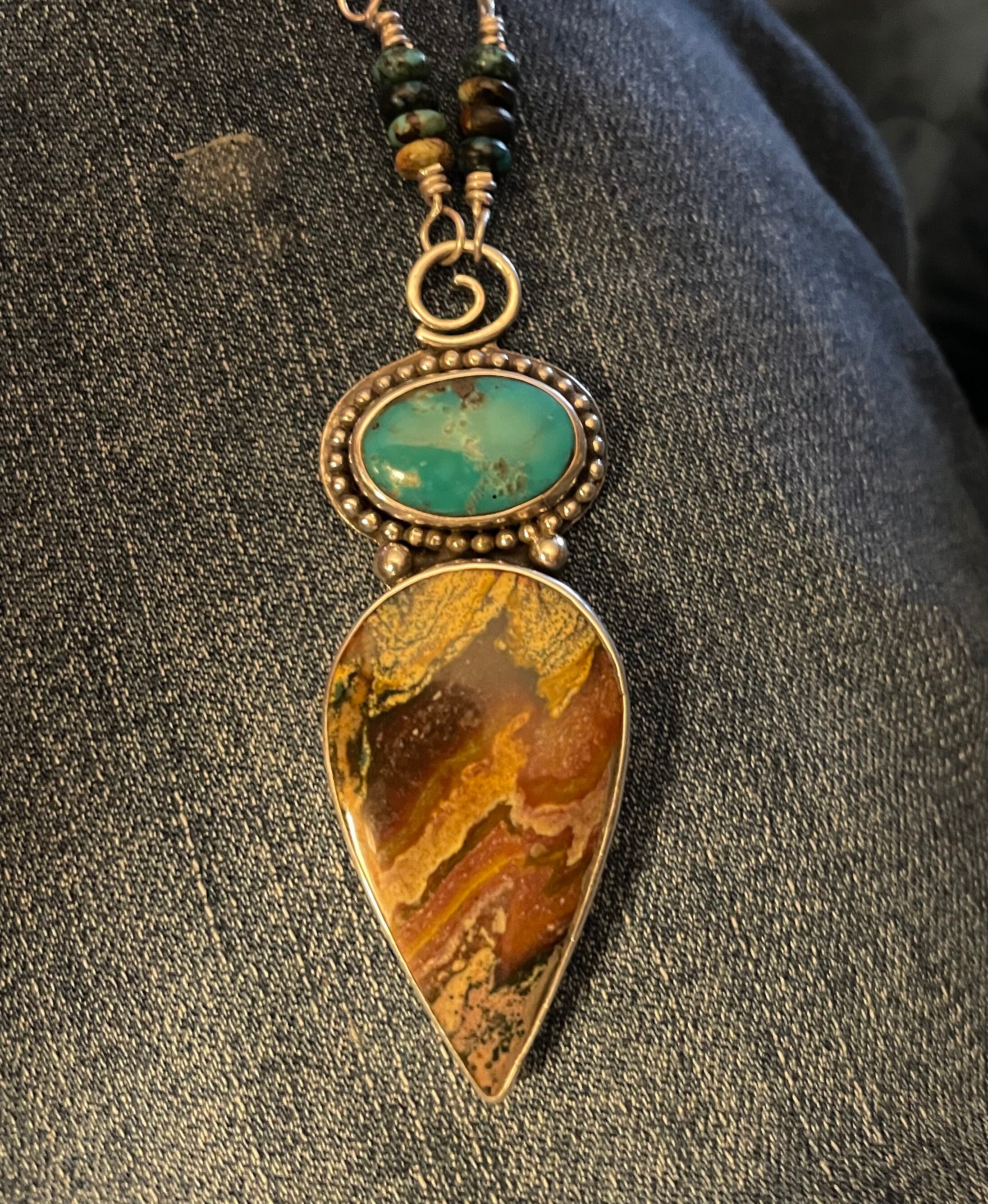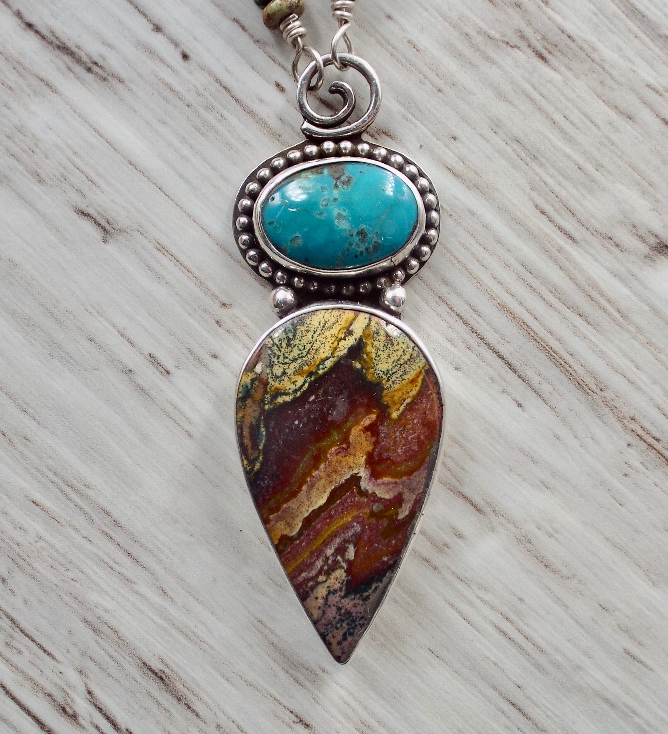 A beautiful pairing of Ribbon Jasper and Turquoise gemstones, This pendant setting is sterling silver and hangs from a silver chain