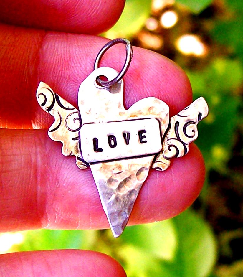 A hammered, asymetrical heart with spiral stamped wings. Love is in the air!