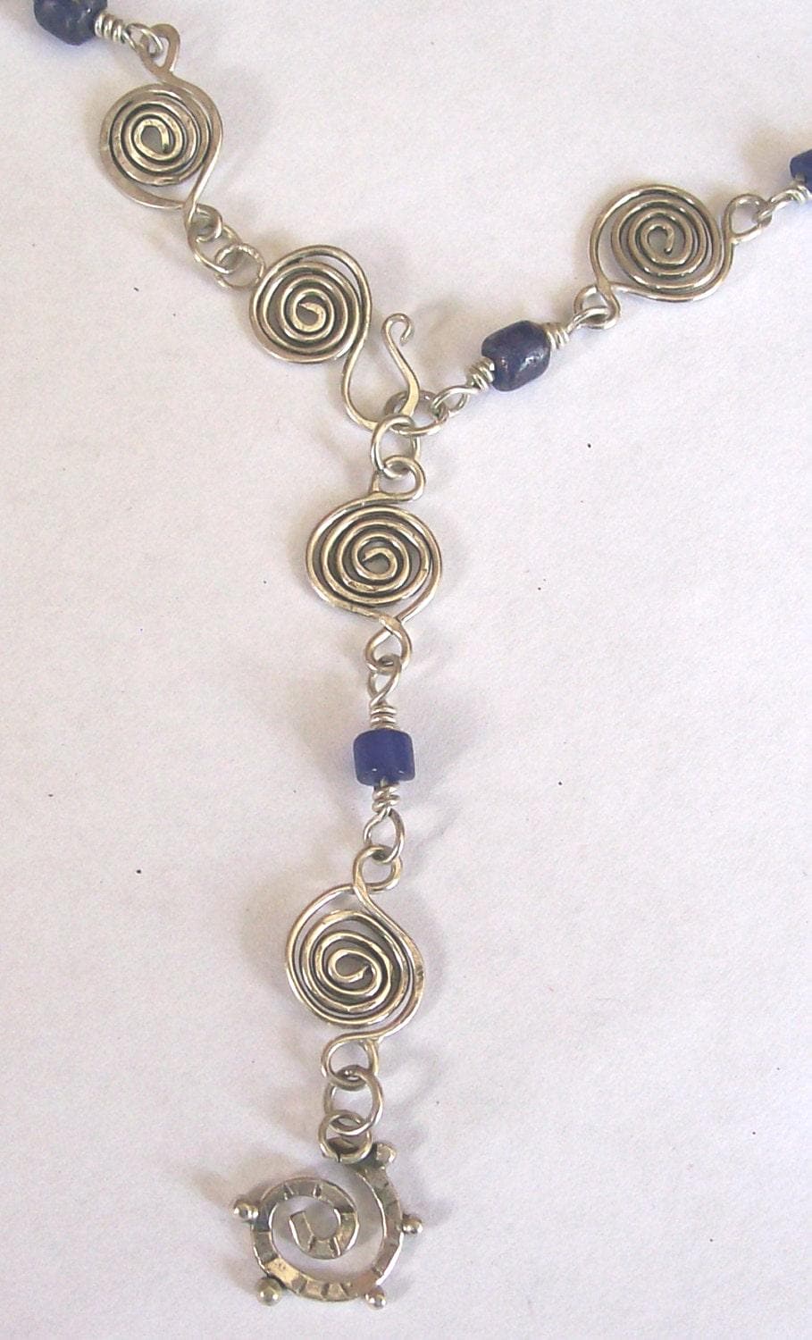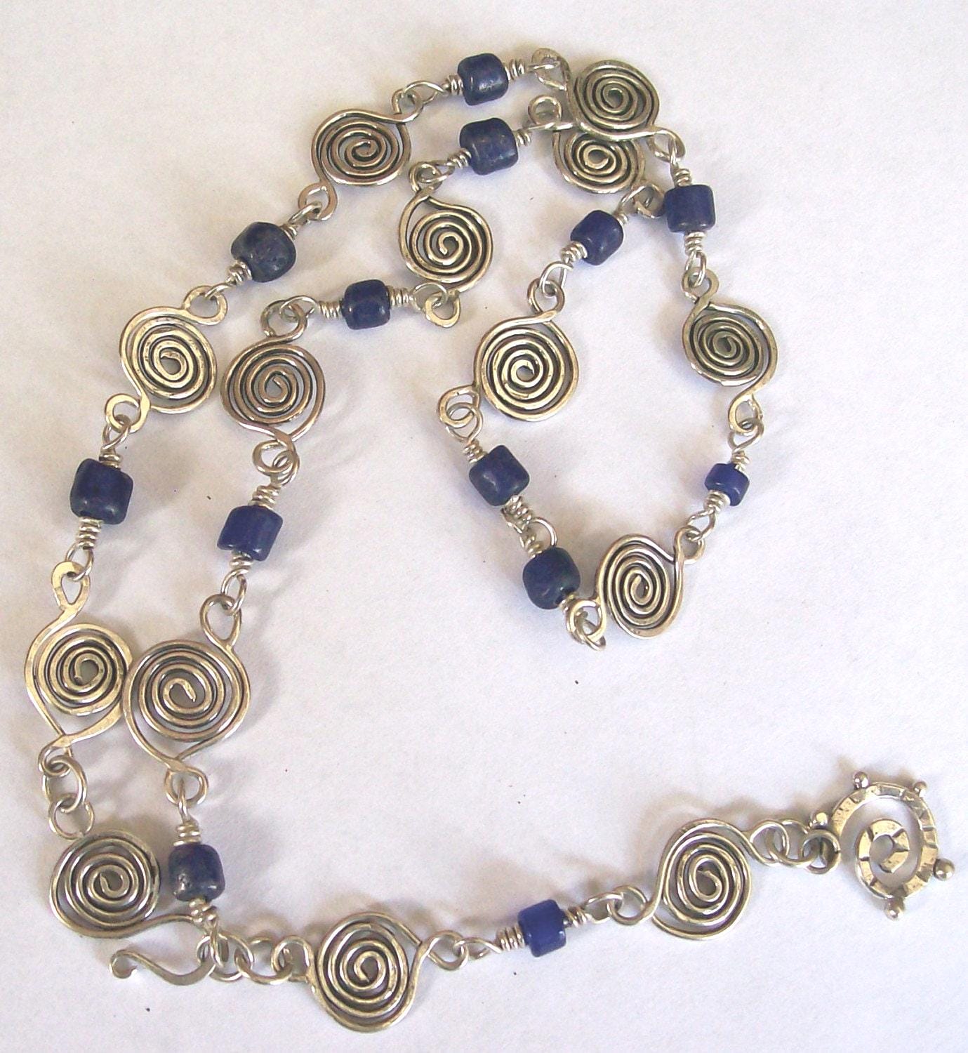 Alternating spirals and recycled African glass beads form this graceful necklace. The chain features an s-hook closure with a delicate spiral charm.