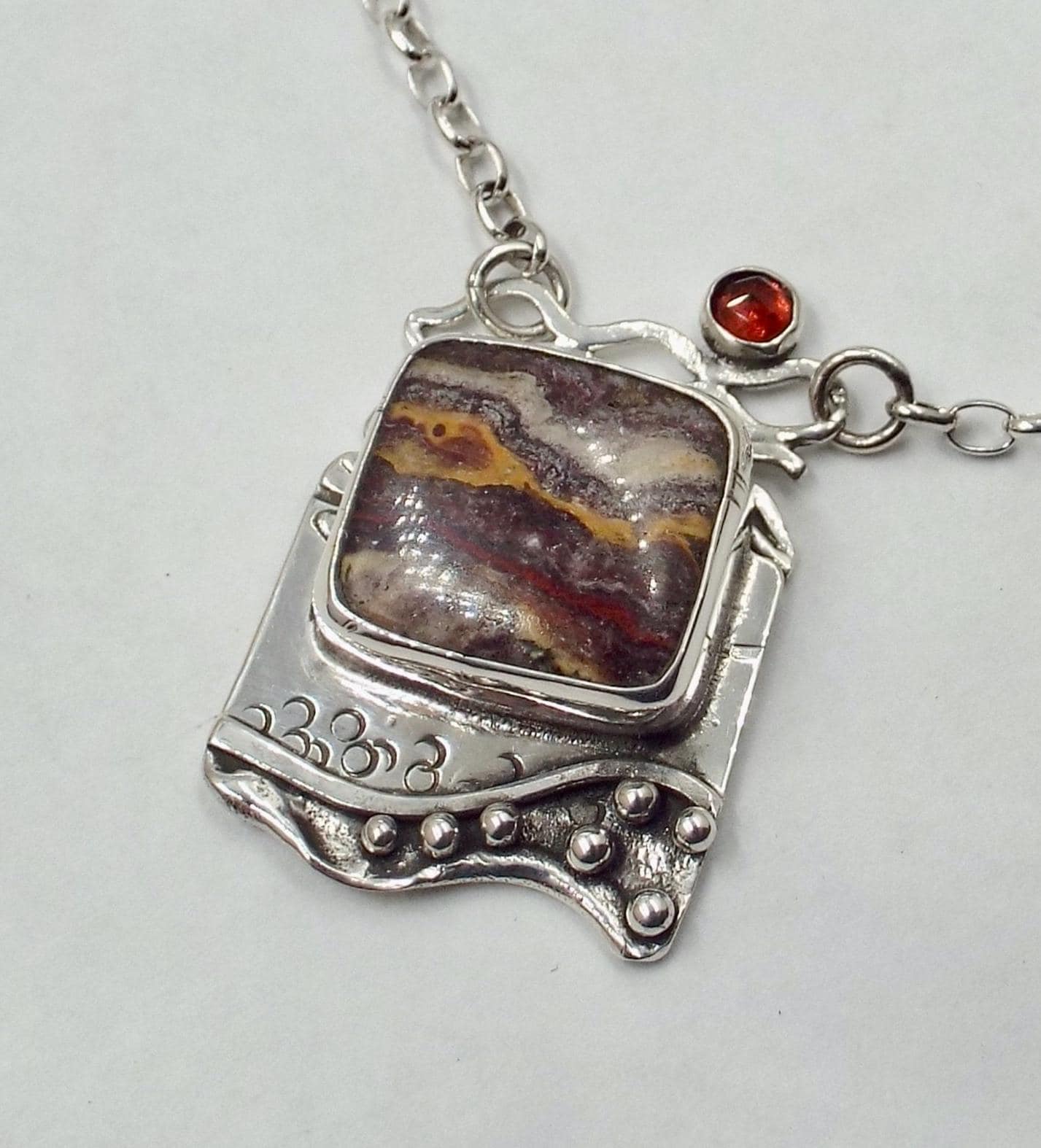 This ia a beautiful striped opal, mined in Utah with a rose cut garnet stone for an accent.