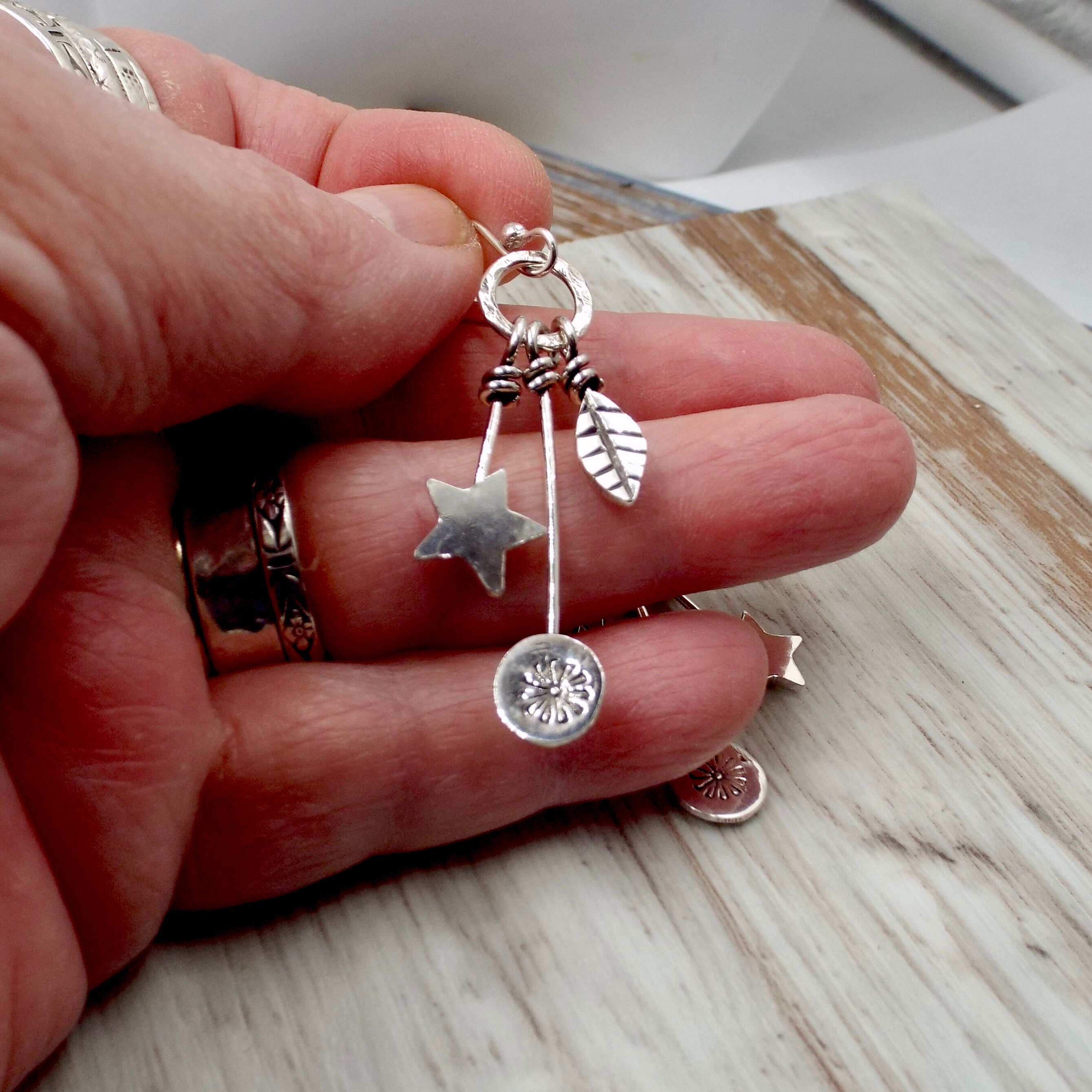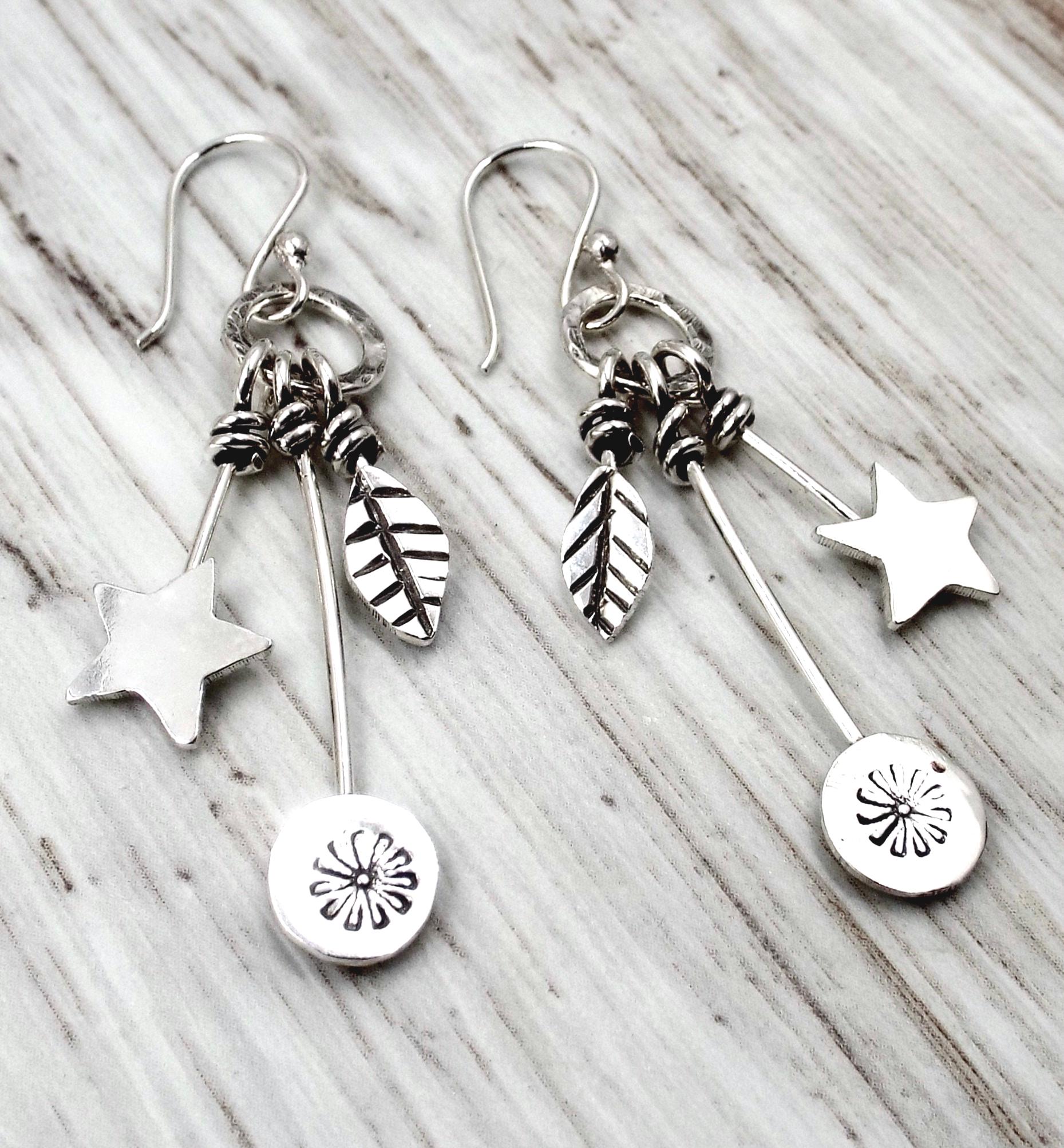 These whimsical earrings contain leaves, stars and circles. They all dangle from a pair of hammered circles which in turn