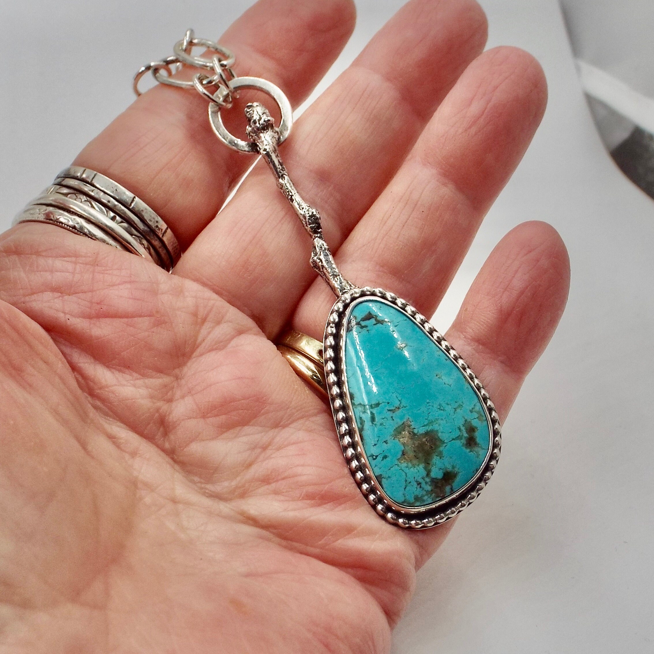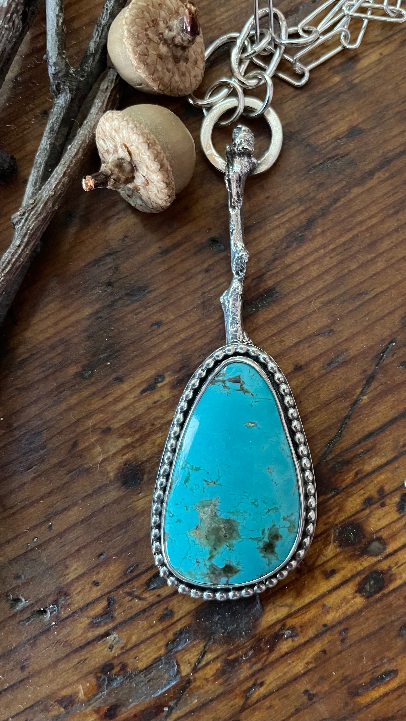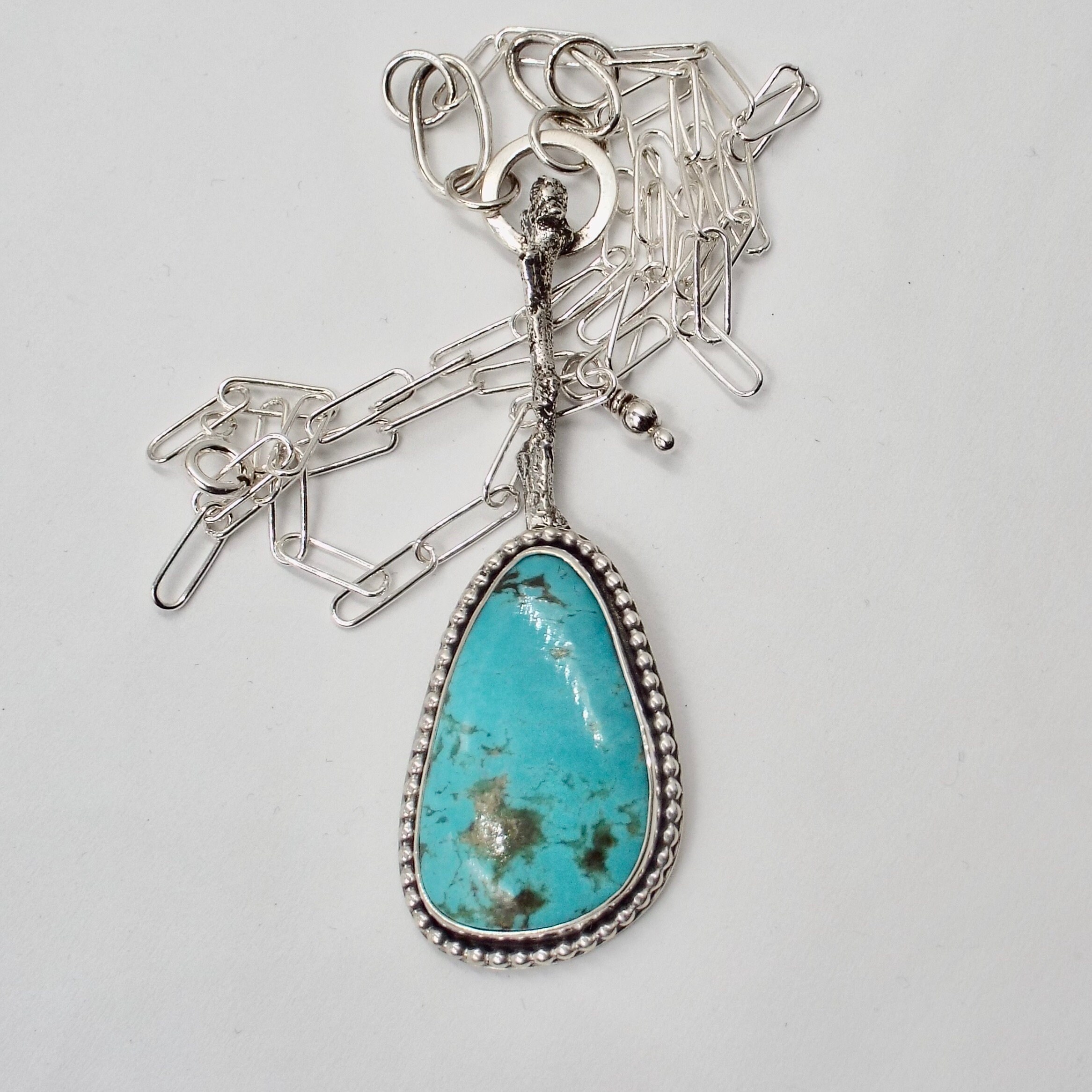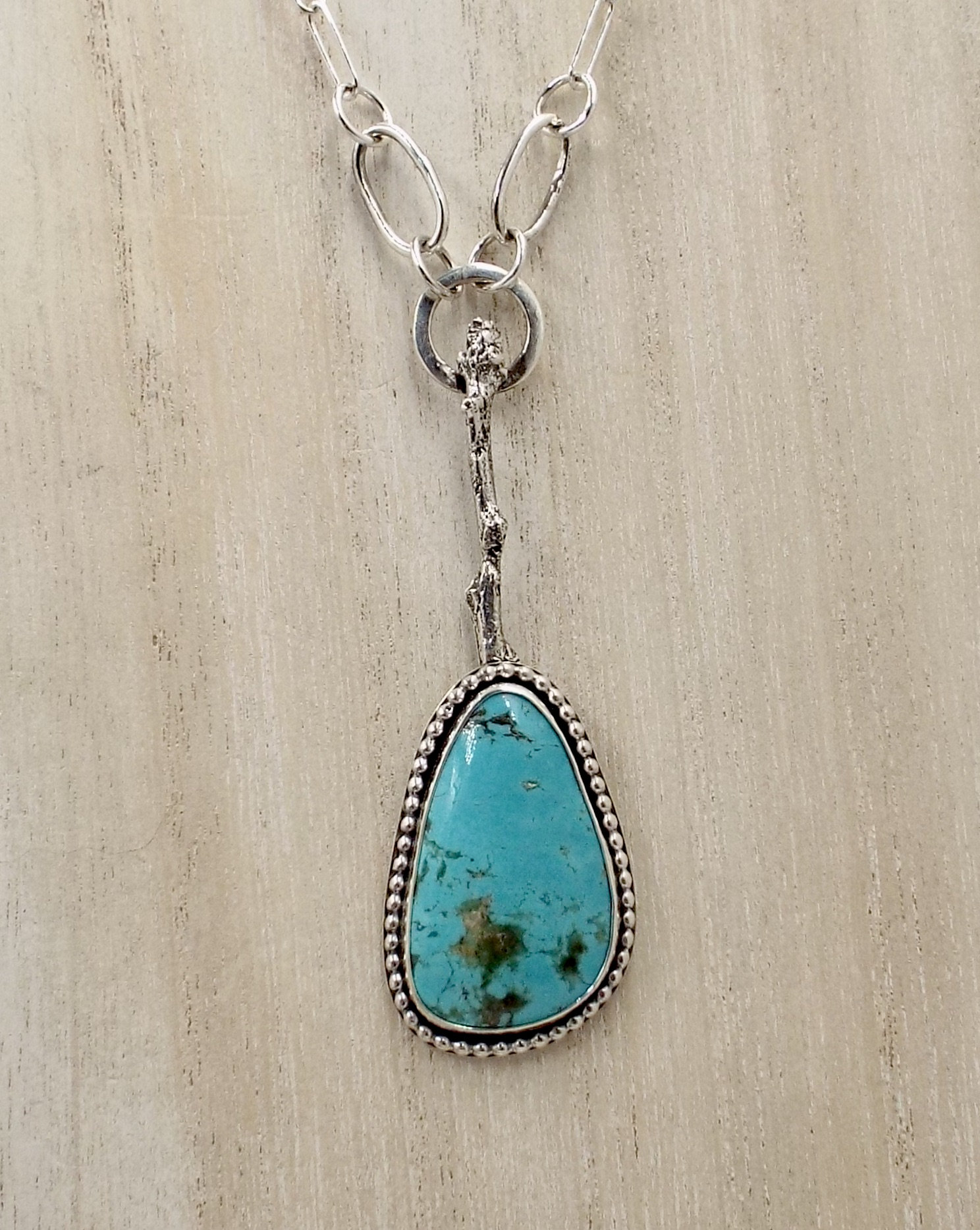 New Mexican Tyrone turquoise is set in sterling silver with beaded trim. A cast silver twig holds this beautiful gemstone. An integral paperclip chain finishes the piece.