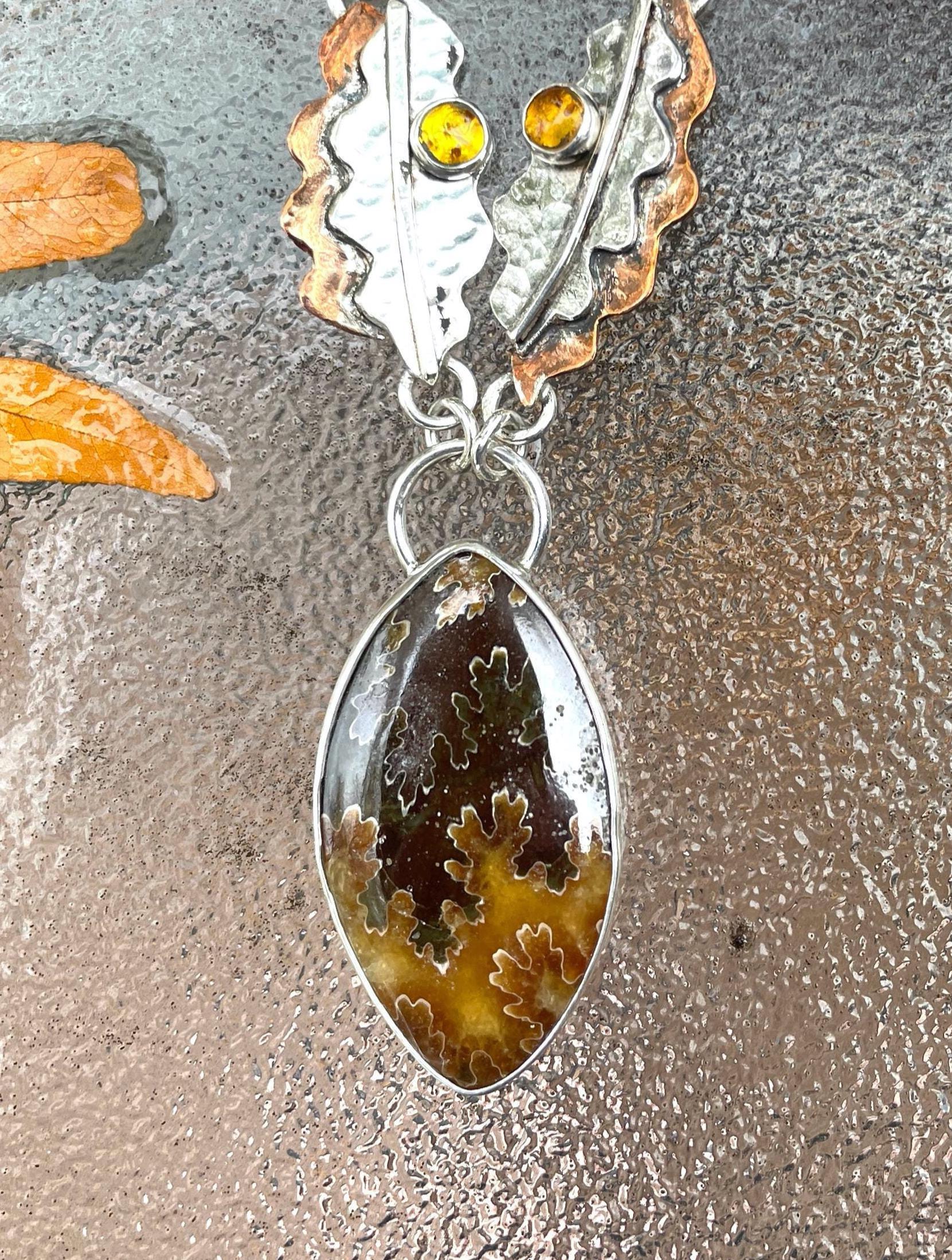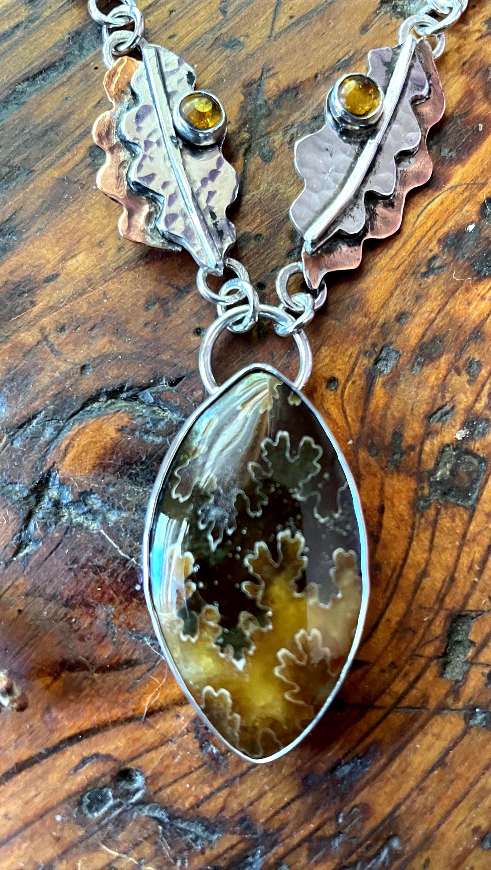 I made the setting from sterling silver. The chain is also sterling. I added leaf shapes in silver and copper with amber and garnet gemstones. This ammonite measures approximately 1 and 1/2" and the chain is 19".