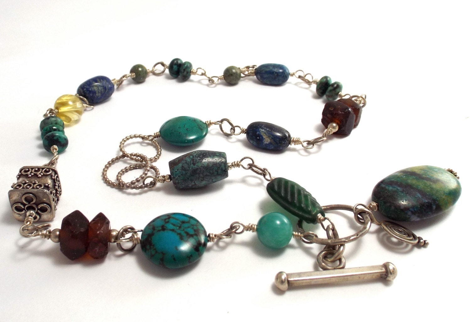 The entire necklace is connected by a series of sterling wire wrapped loops and handmade sterling rings.