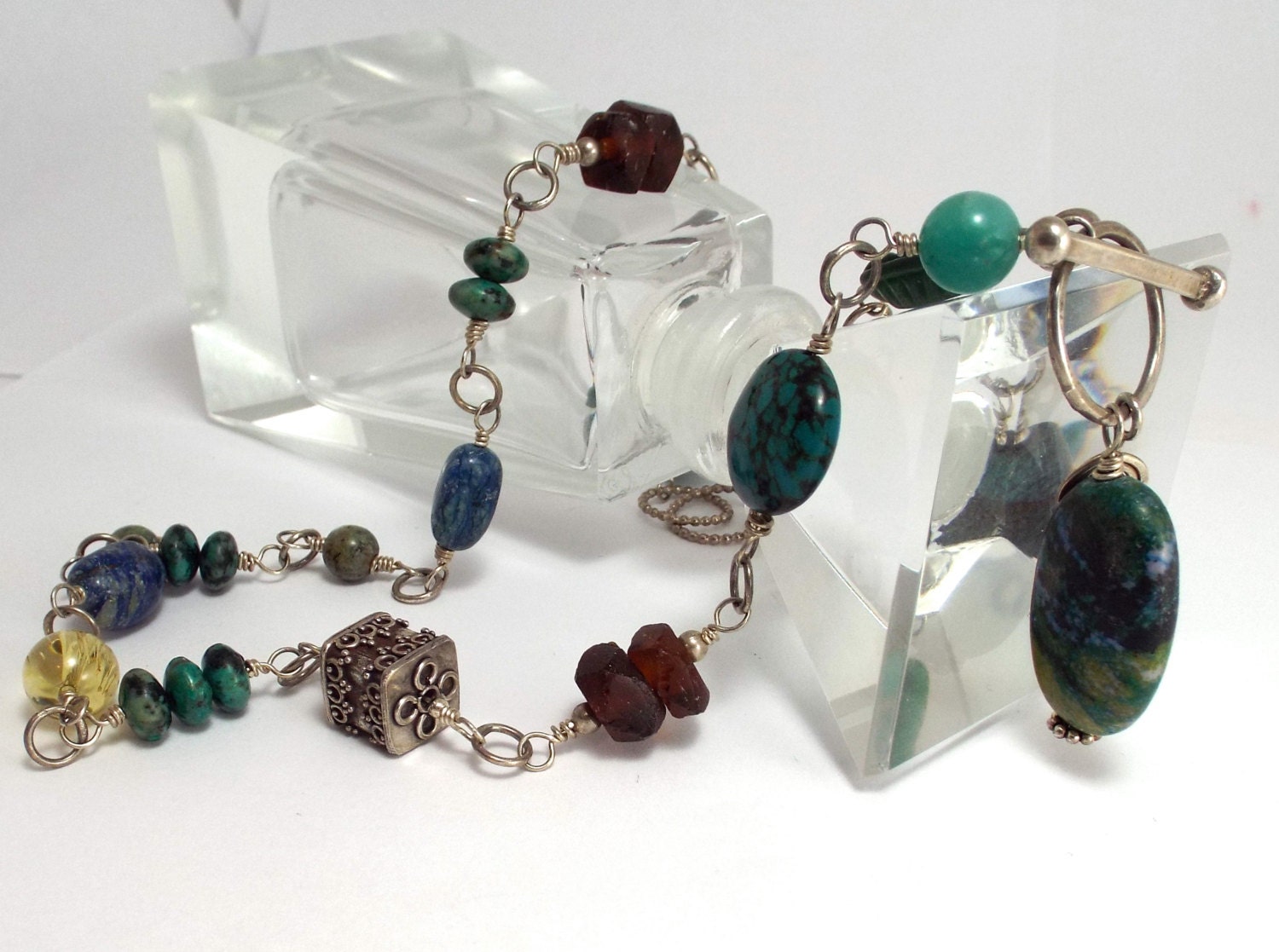 The stones include turquoise, rutilated quartz, African turquoise ( a jasper), sodalite, recycled African glass and one large Bali style square sterling bead.