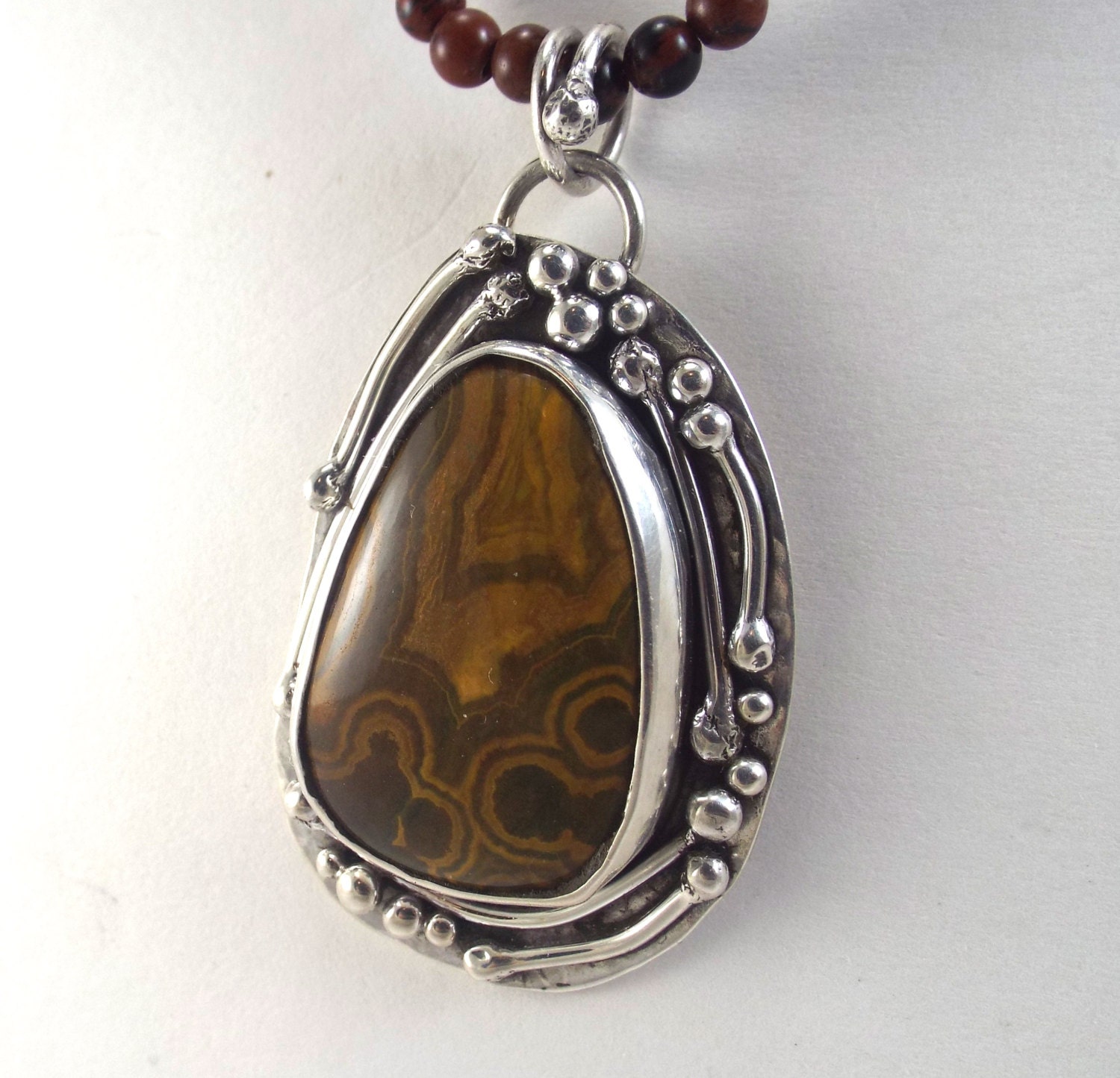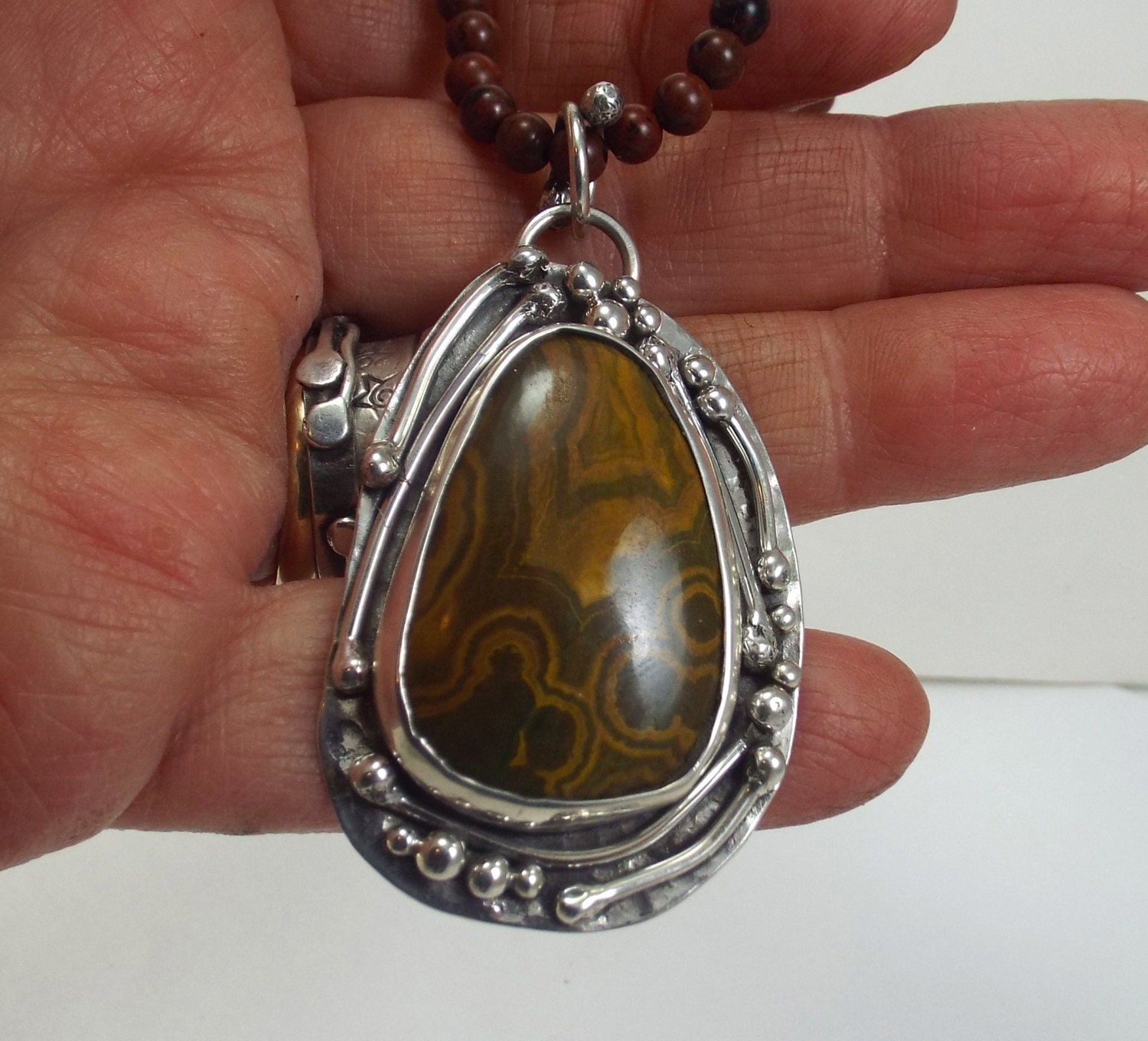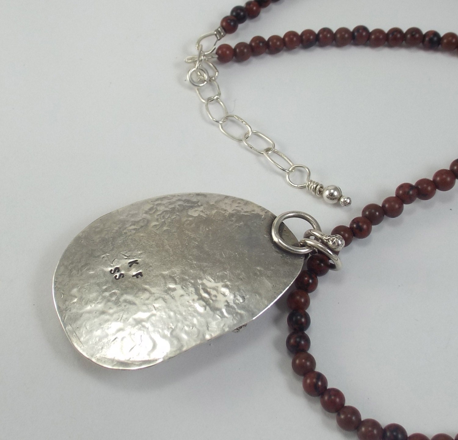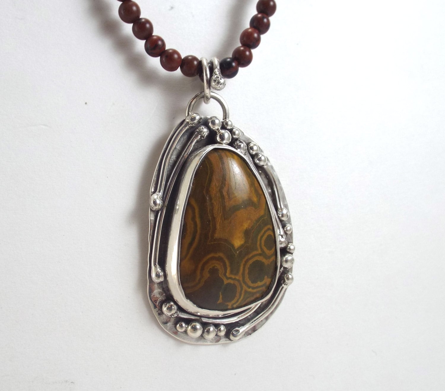 This beautiful Ocean Jasper cabochon is set in a large sterling setting, embellished with curving wires and a jumble of sparkling silver balls. It hangs from a coordinating Obsidian Jasper gemstone necklace.