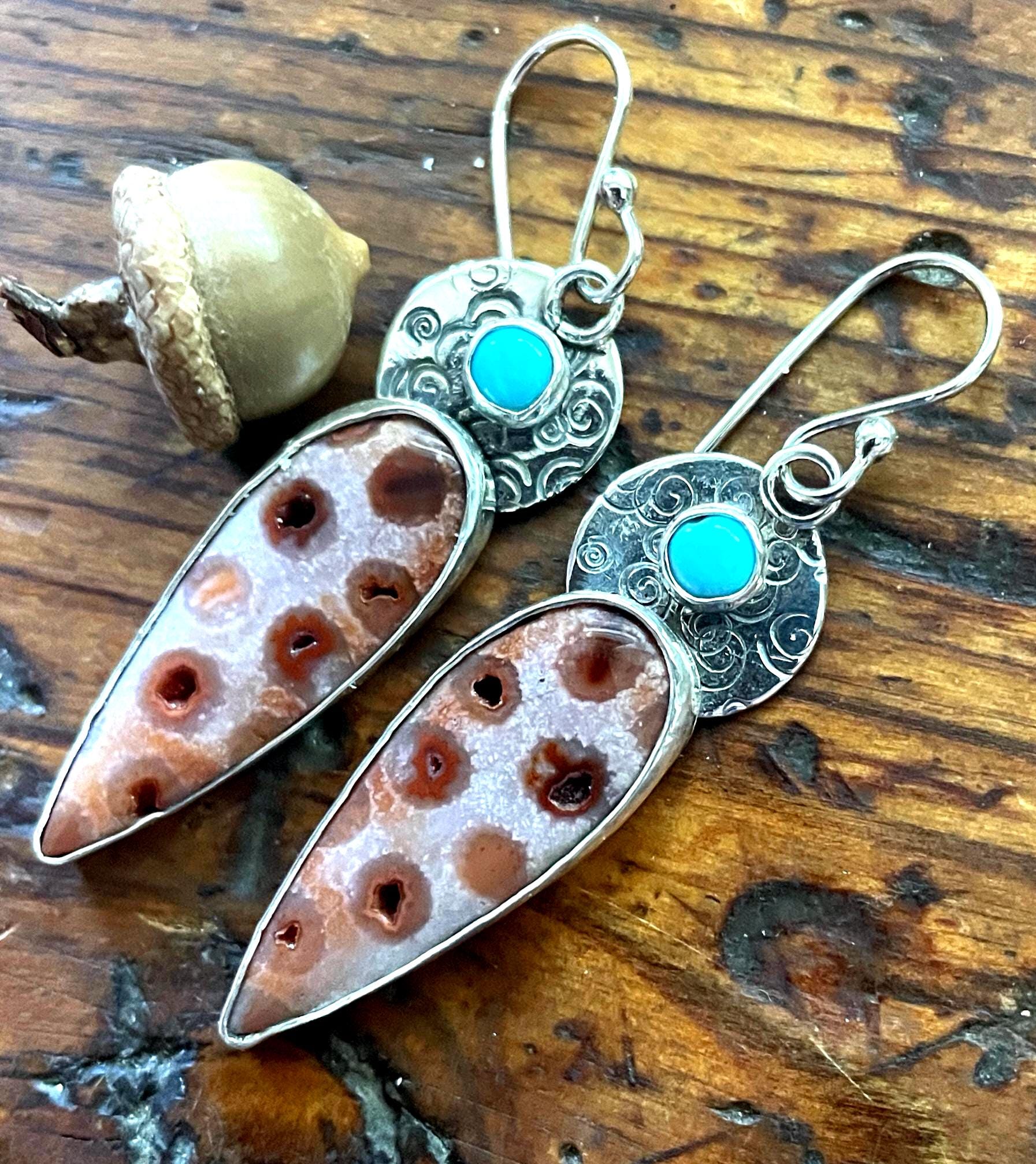 Kingman turquoise is paired with fossil coral in these sterling silver earrings. On top the 5 mm turquoise stones are surrounded by a halo of stamped silver. The fossil coral features vugs, ( small holes found in the fossil) that create a wonderful polka dot like look.