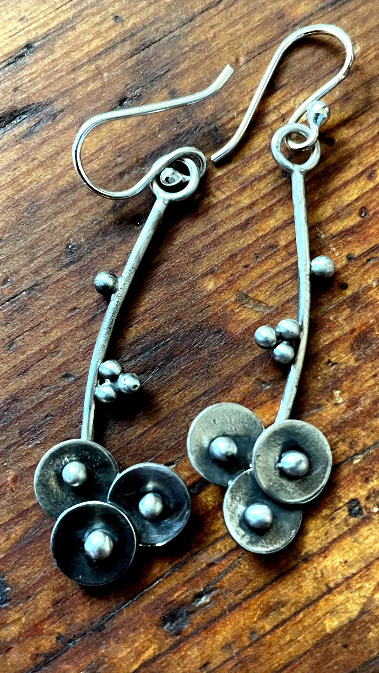 I made these earrings by hand in my studio out of sterling silver. They measure about 2" from the top of the ear wires.