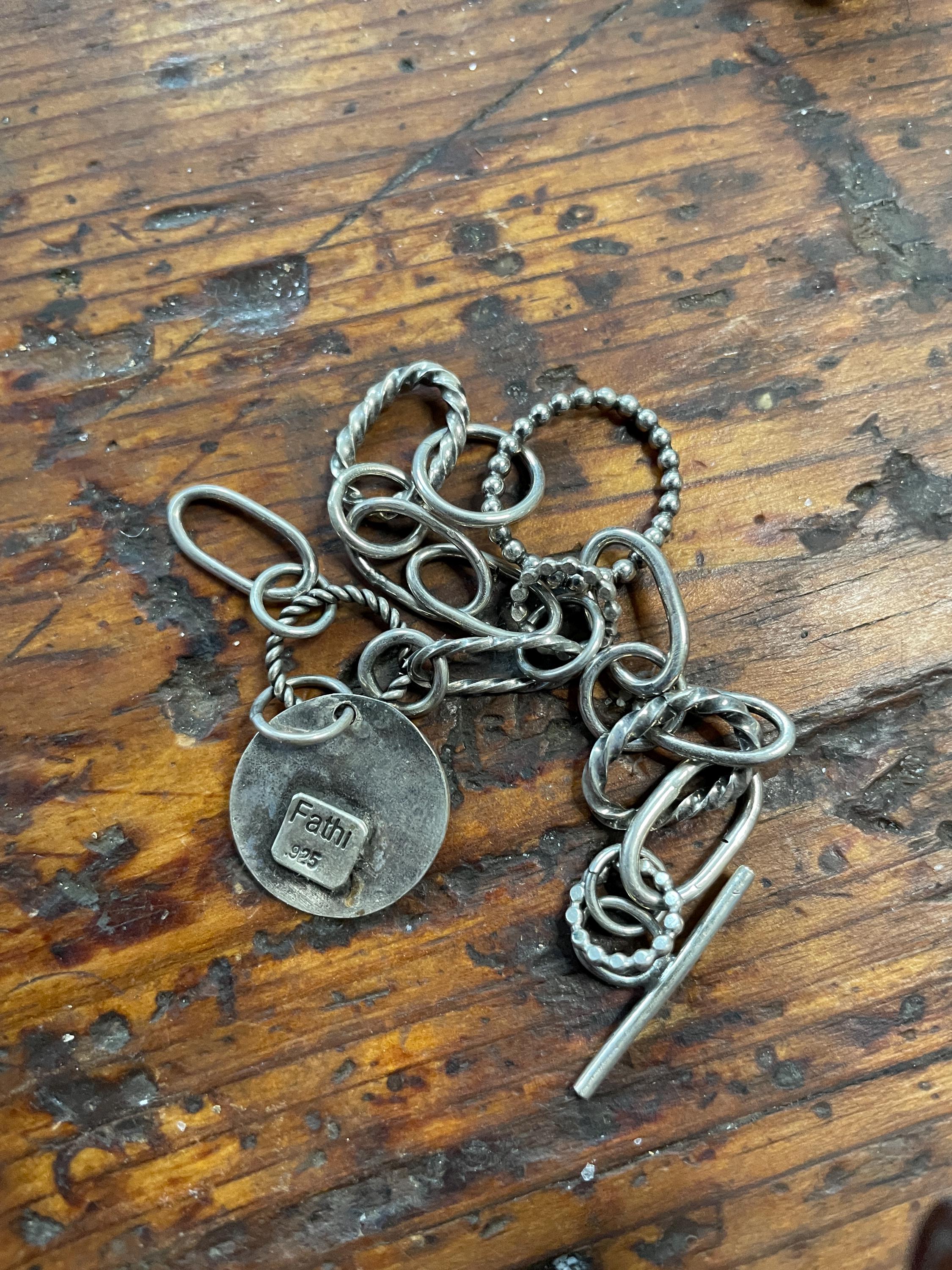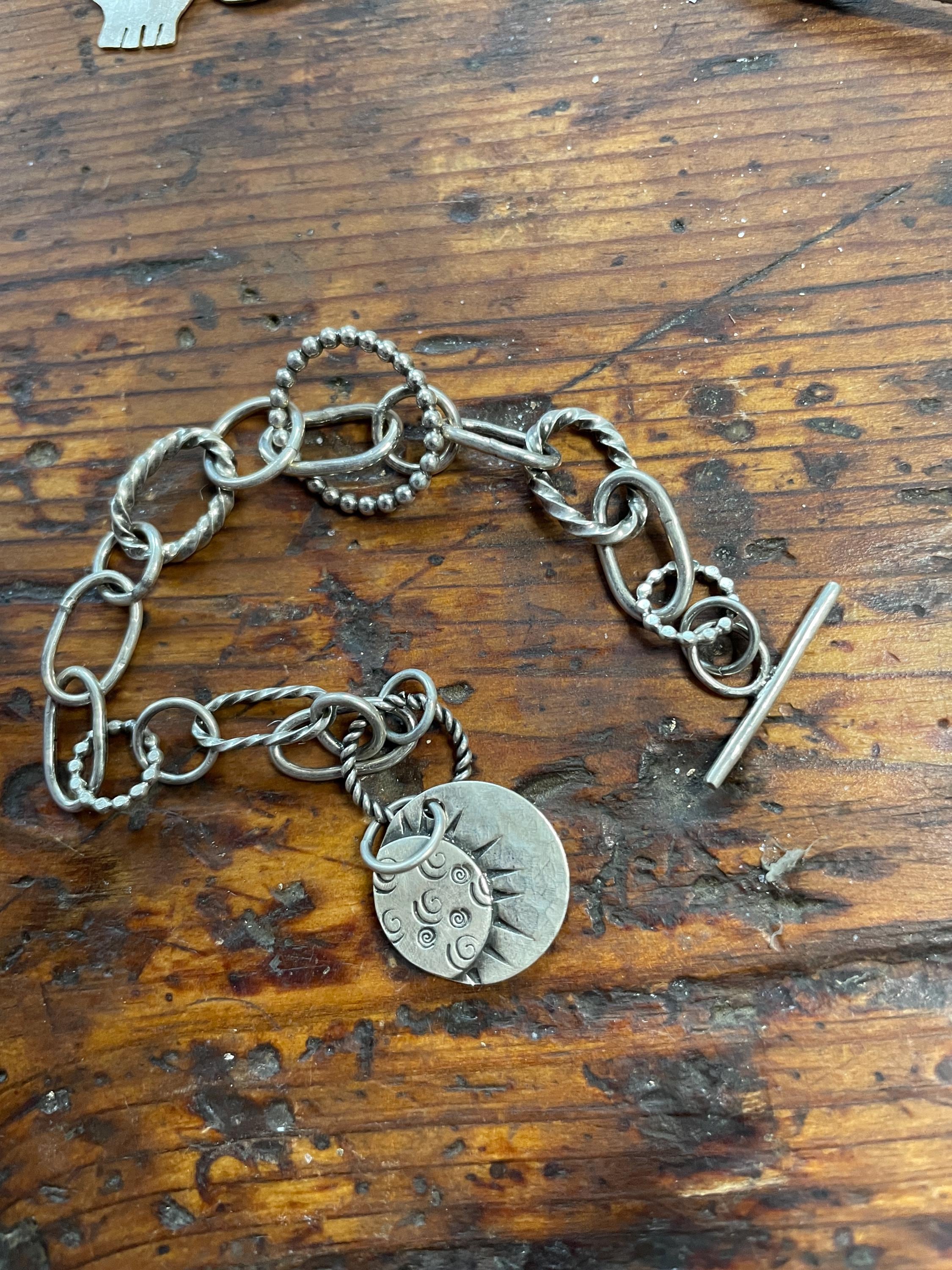 This bracelet is made of all shapes and sizes of links. Twisted wire, ball wire and hammered links as well as a toggle closure and a celestial charm.