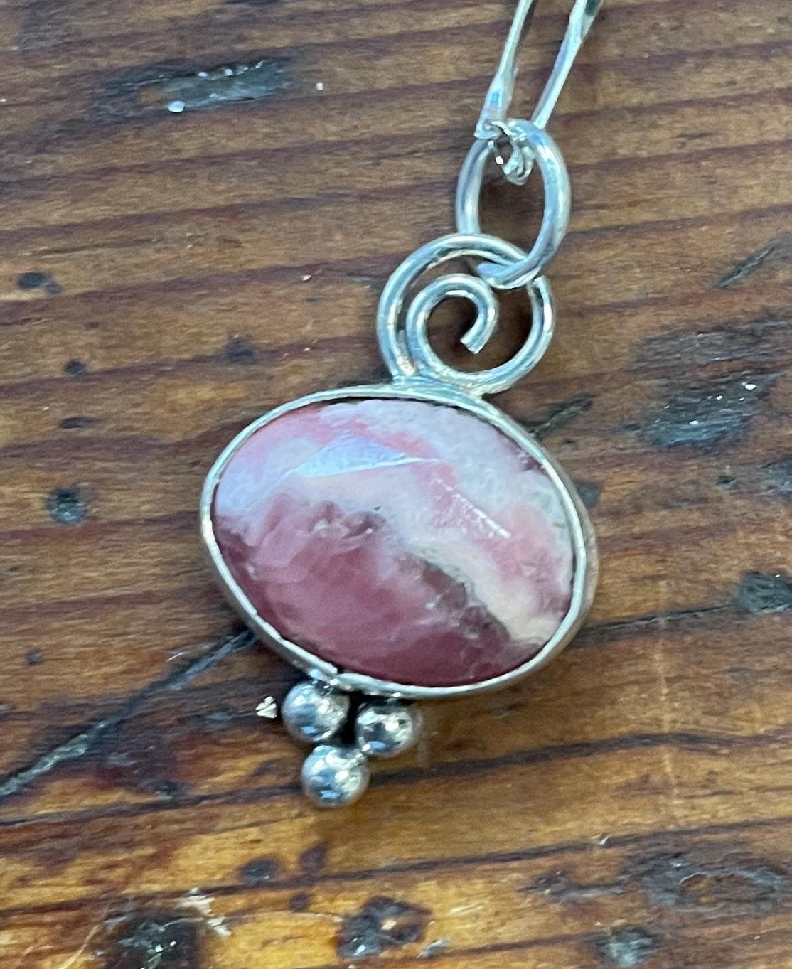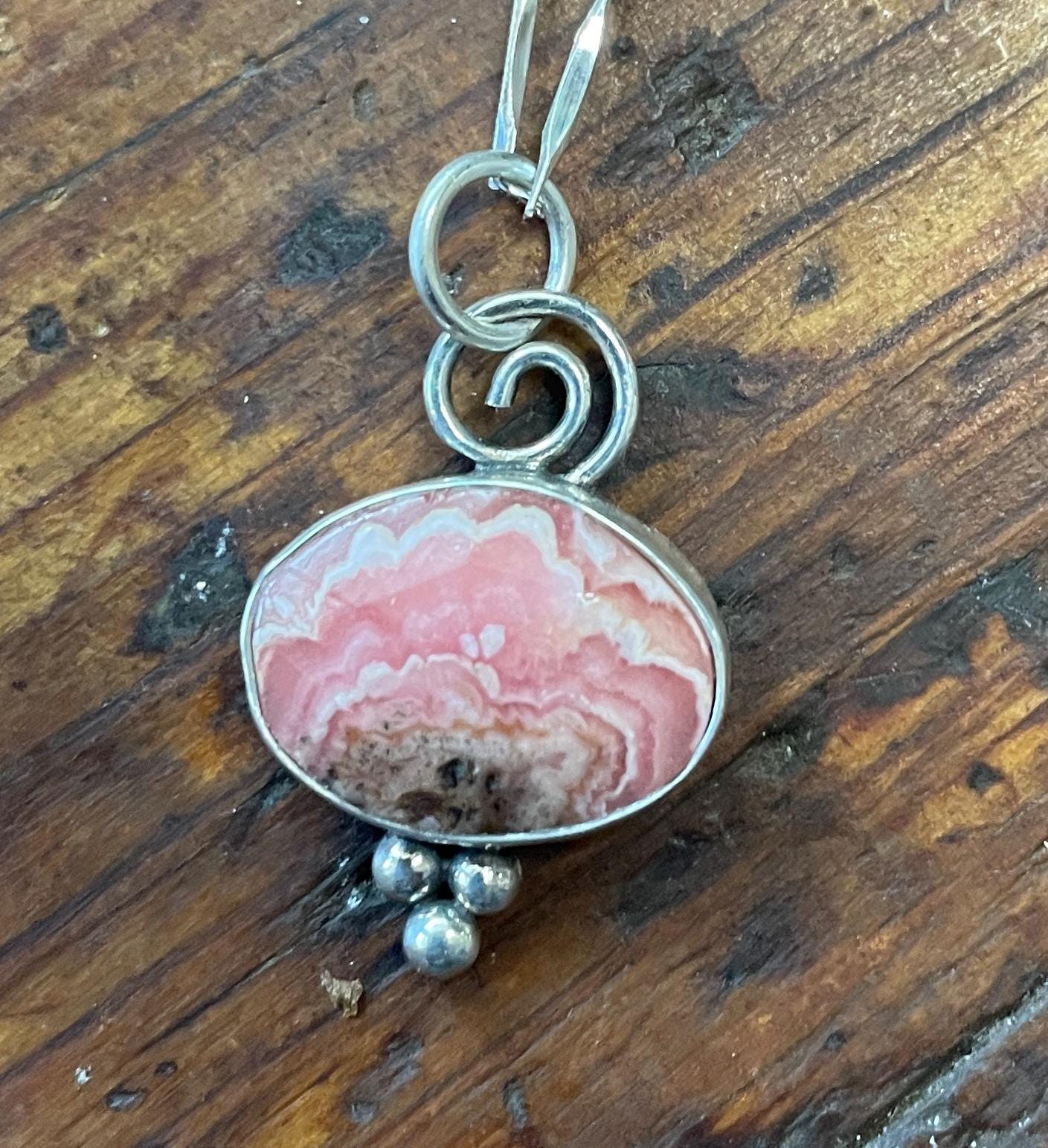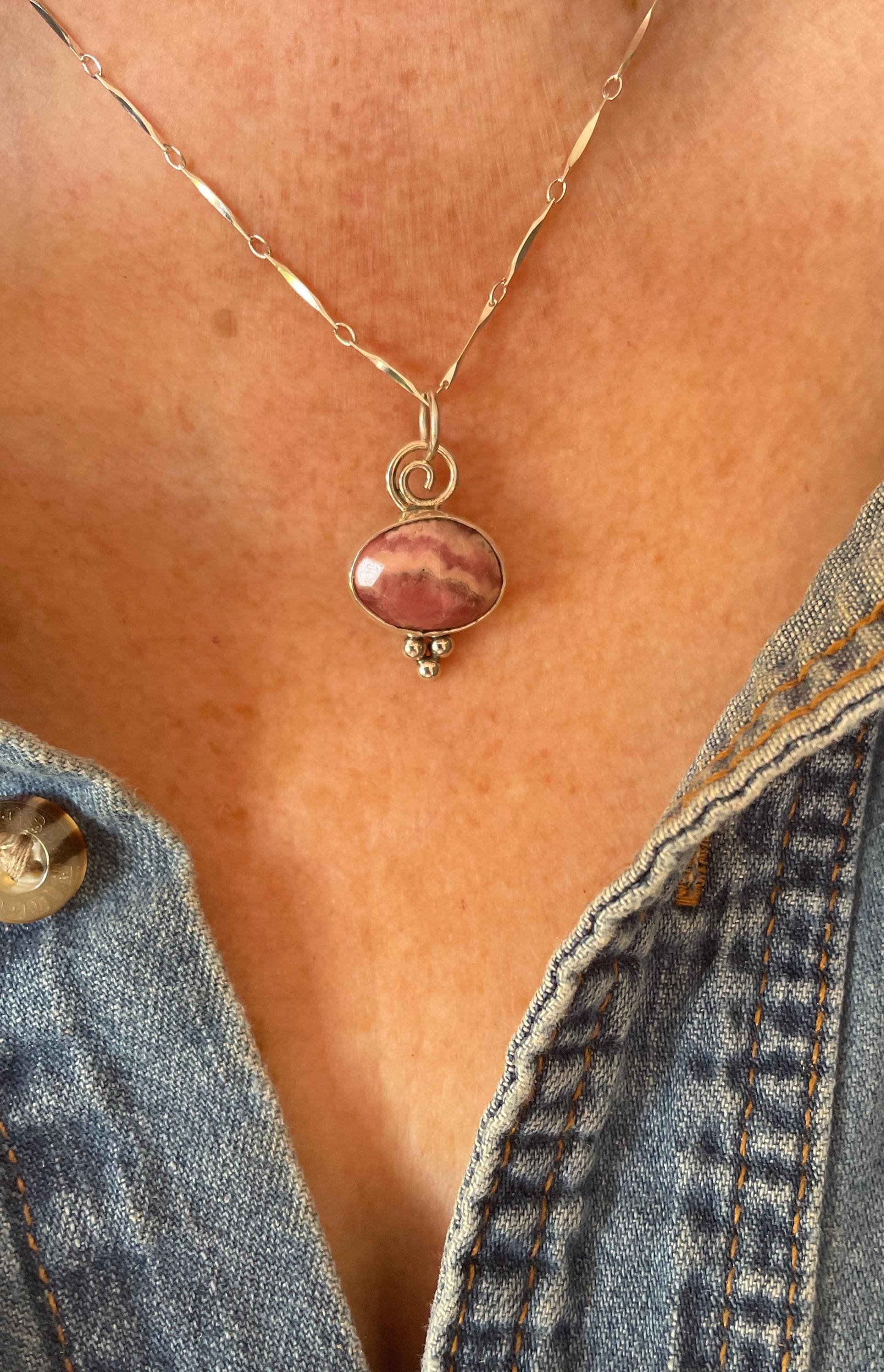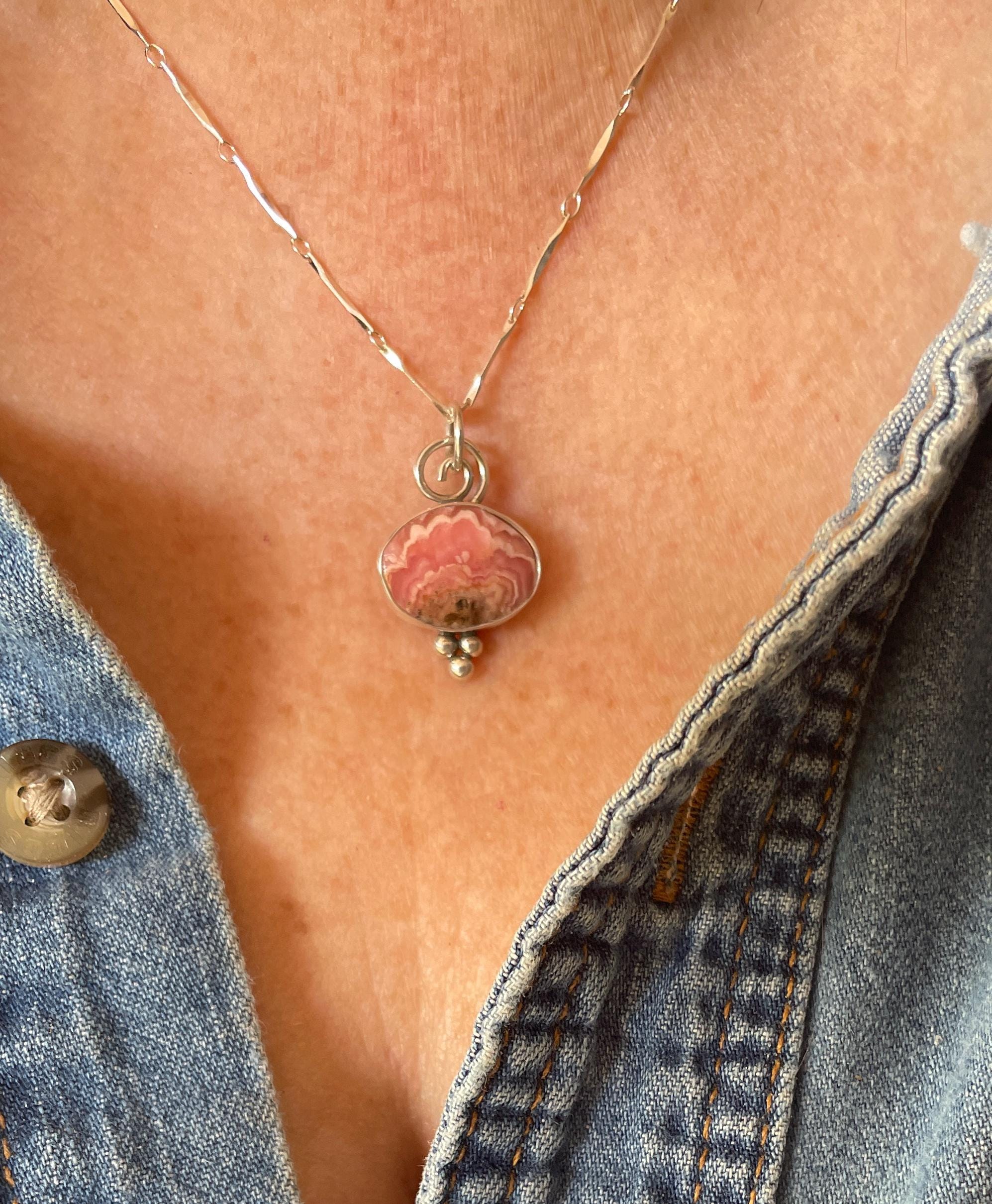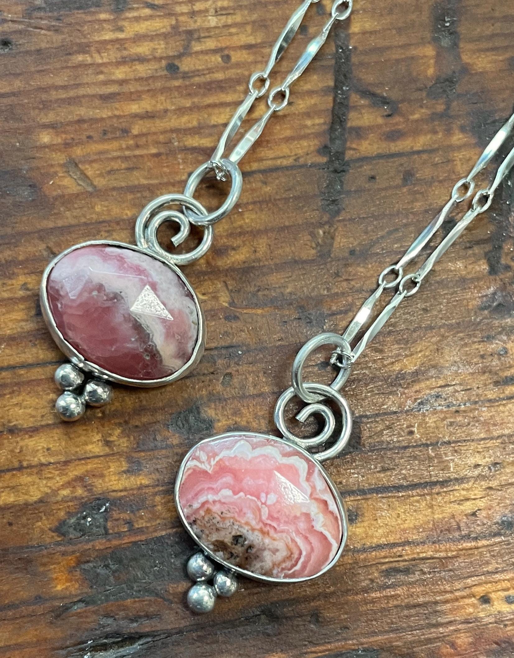 These Rhodochrocite Pendants are small rose cut stones, set in sterling silver and hanging from 18" delicate chain.