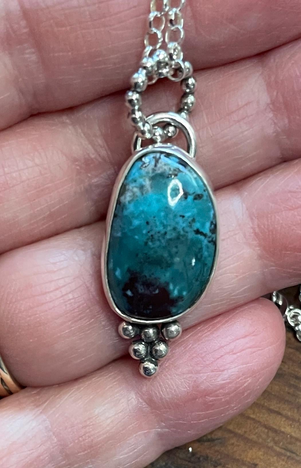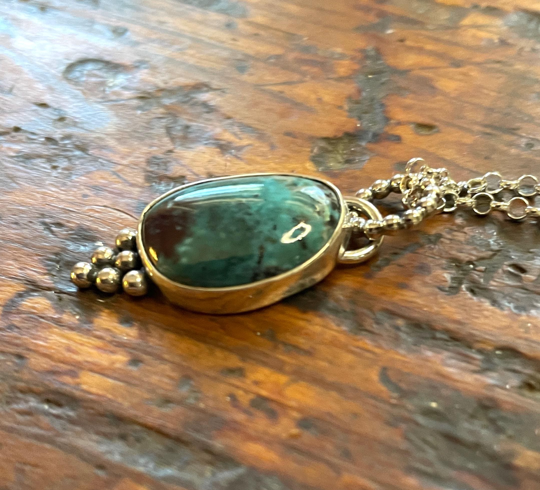 A beautiful polychrome Morenci Turquoise is the main feature of this pendant.
