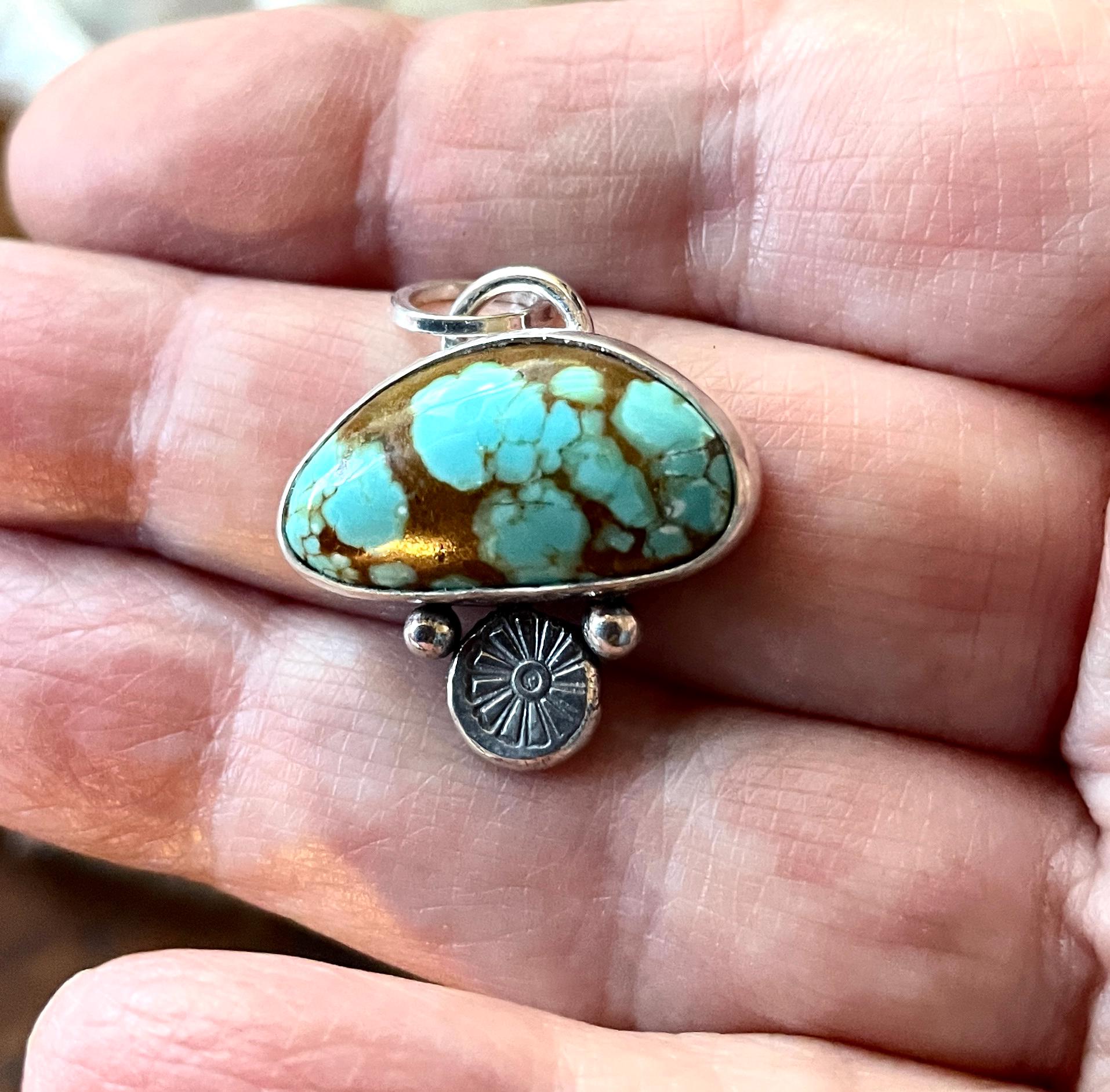 A Turquoise freeform pendant with hand forged and stamped silver design.