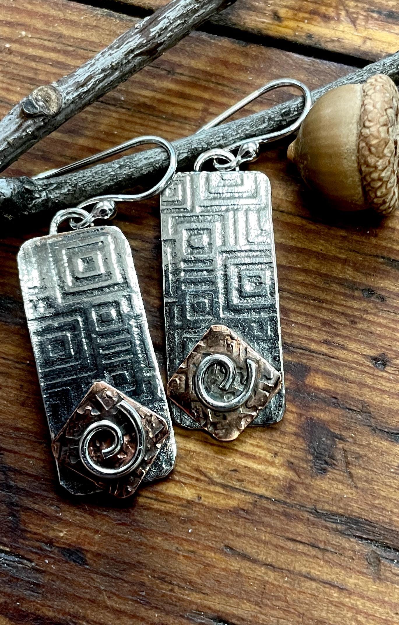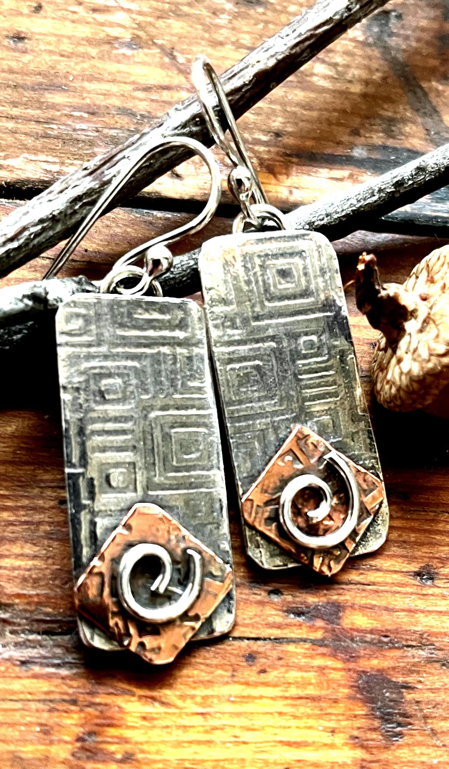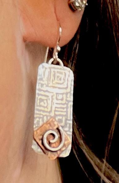 These rectangle earring have a geometric pattern on the silver. Copper squares are accented with silver spirals. They are about 1 3/4" long from the top of the ear wires down.