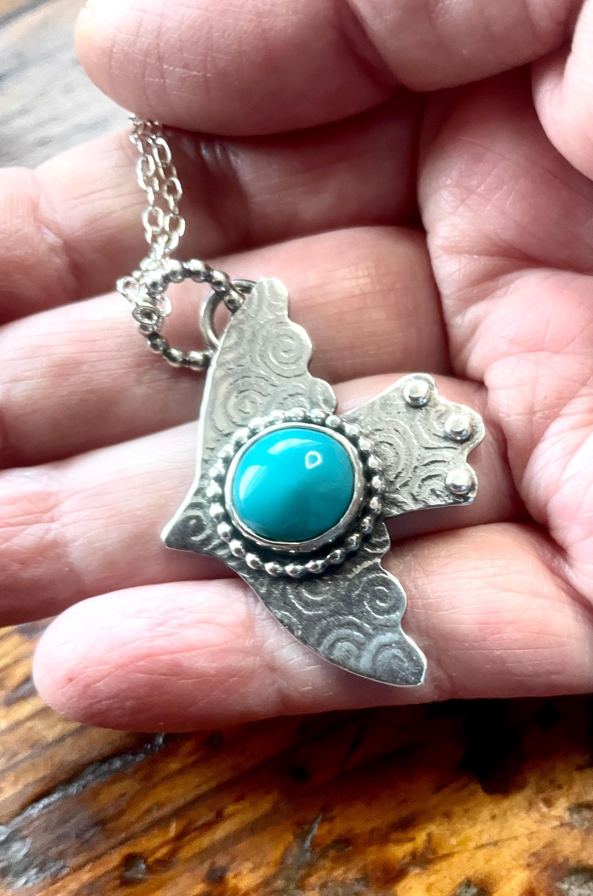 A classic Peace Dove holds a beautiful American mined turquoise trimmed with silver balls. The body of the dove has delicate swirls all over and is accented with small circles.
