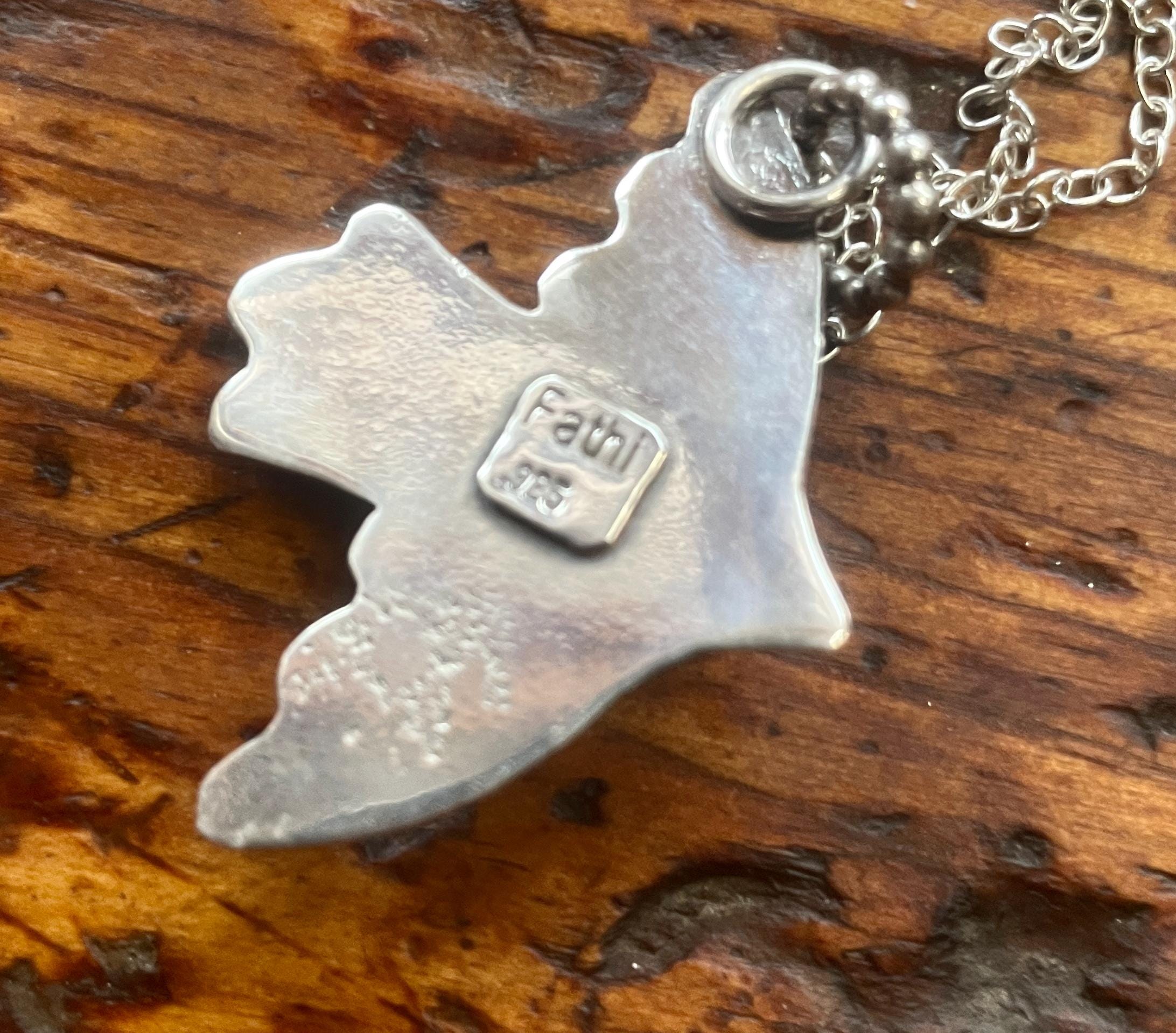 One of a kind and made individually, it is part of a collection of Peace Doves I've been creating. The piece come with an 18" fine chin of sterling silver.
