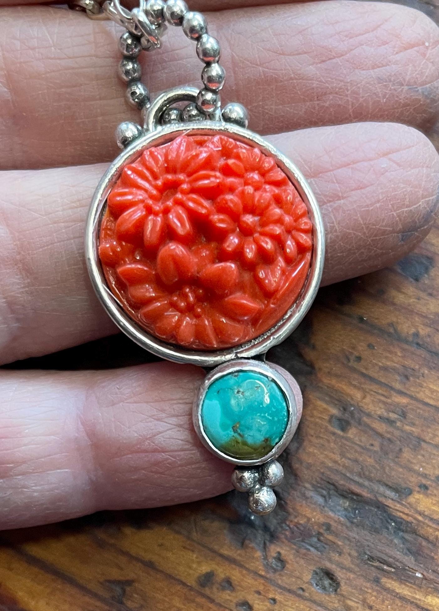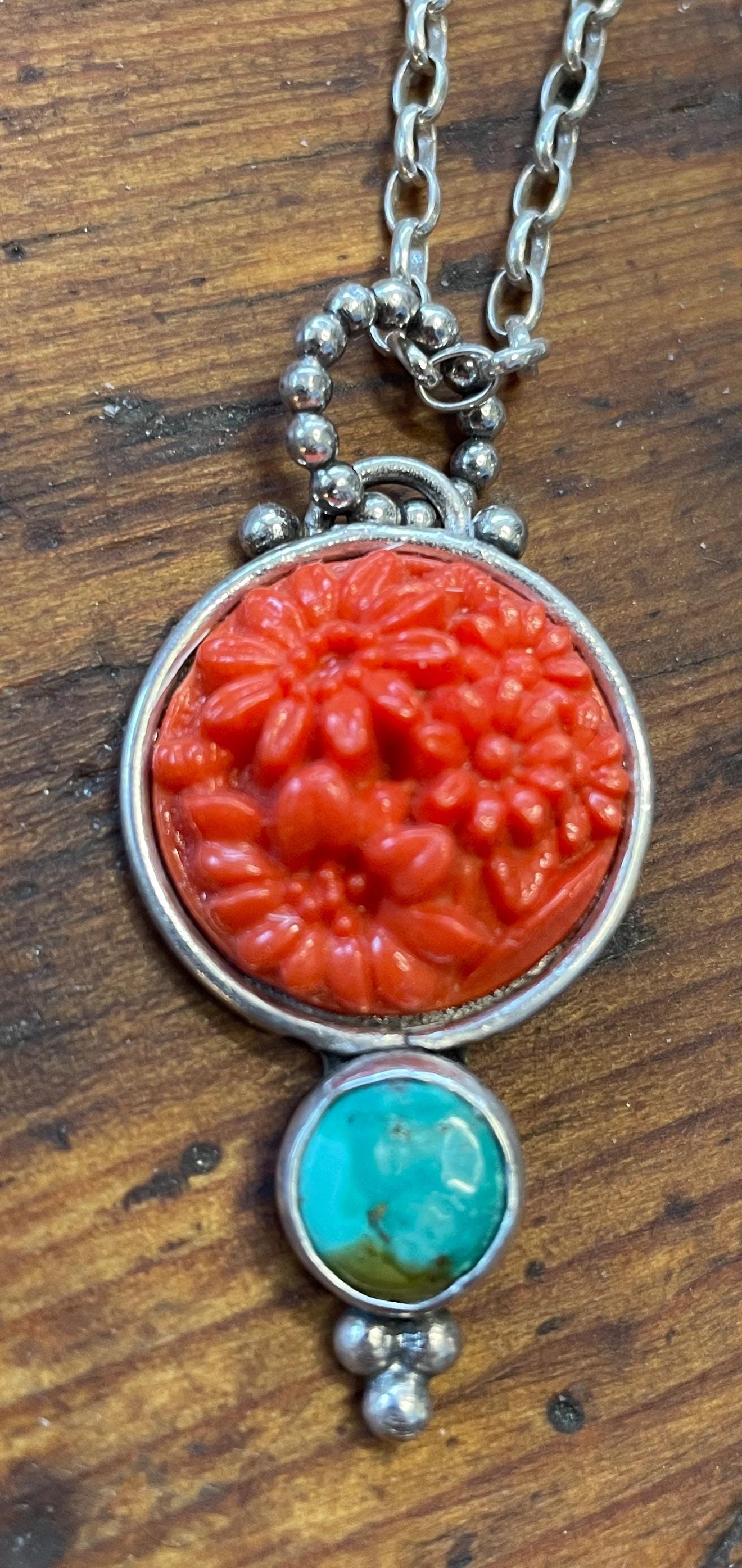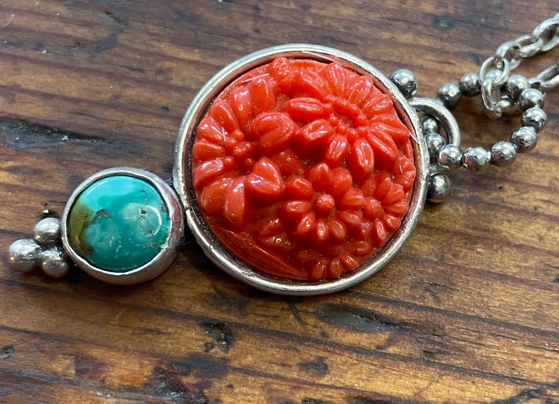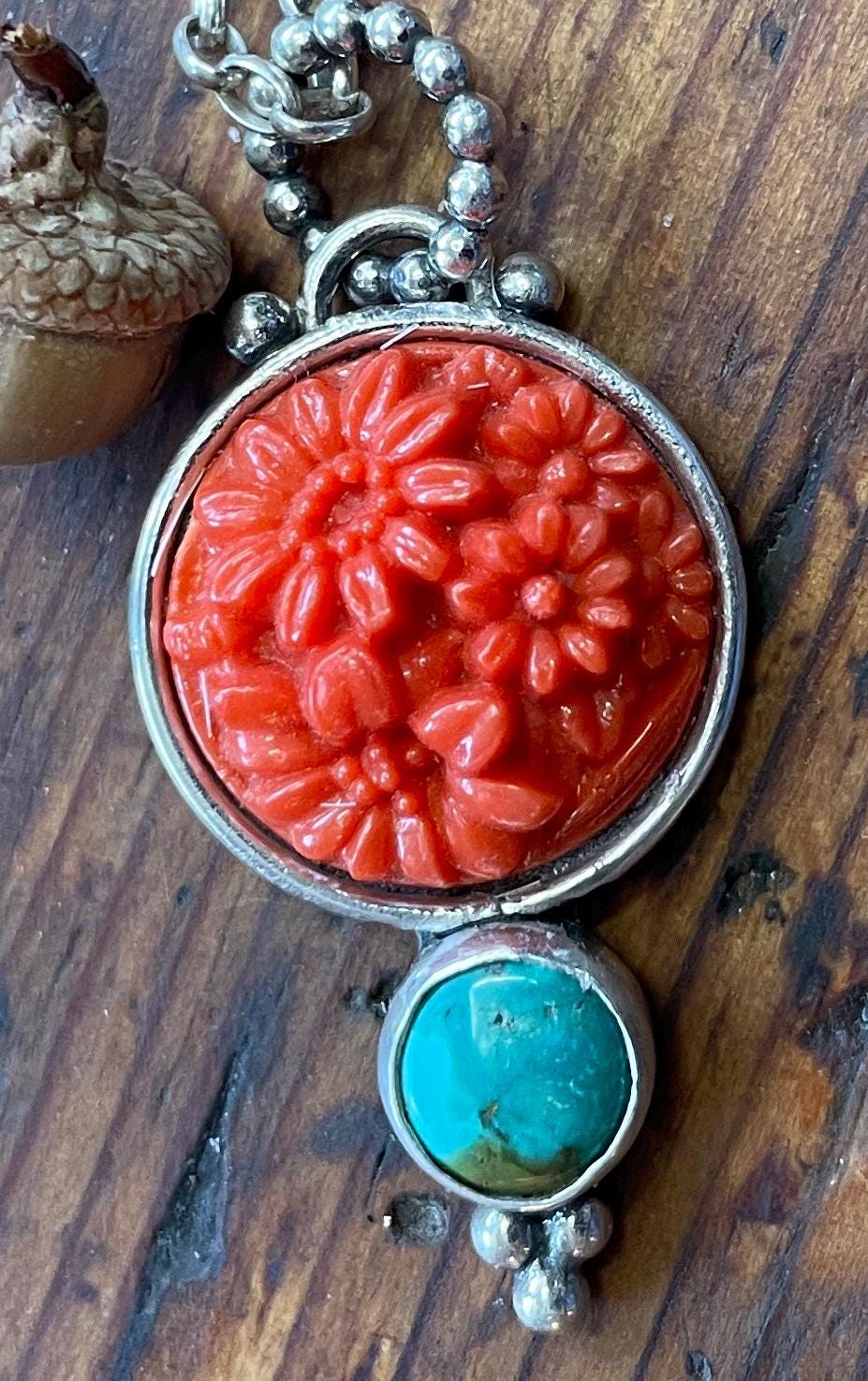A vintage coral colored glass cabochon from the 1950's is the centerpiece of this pendant.