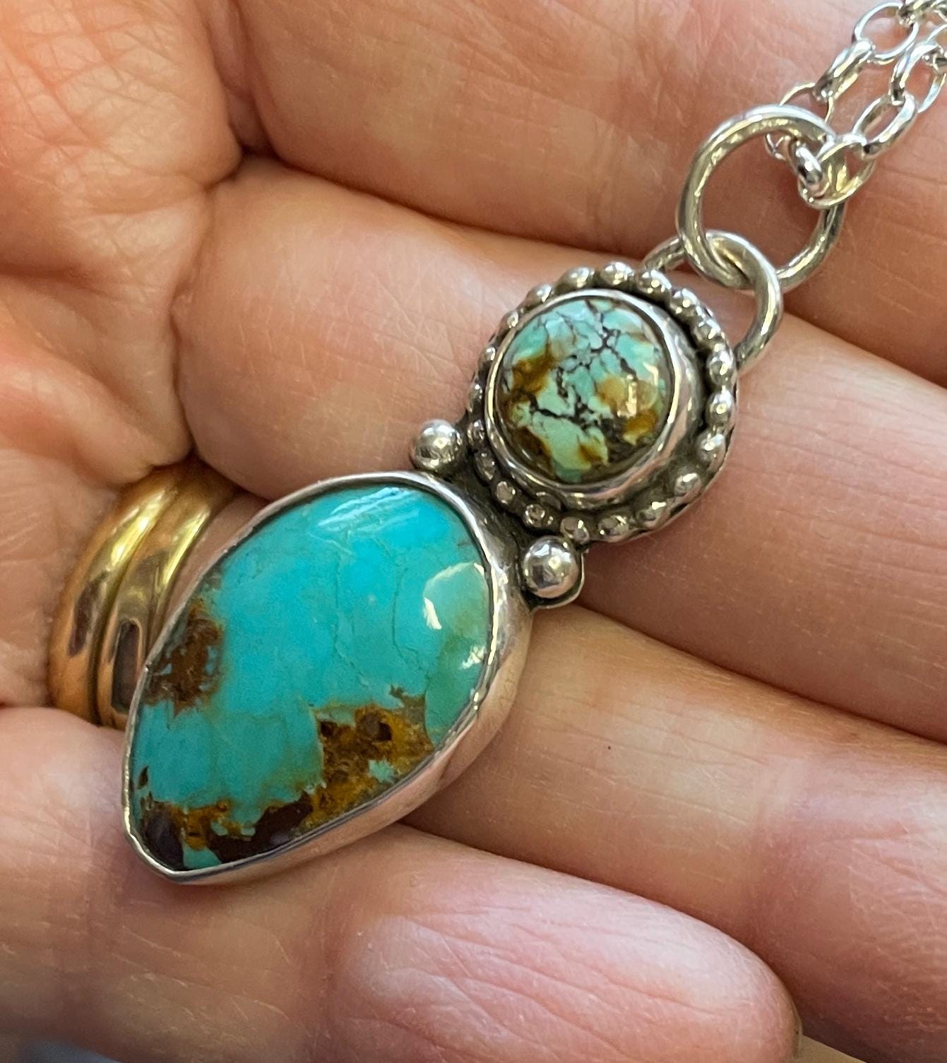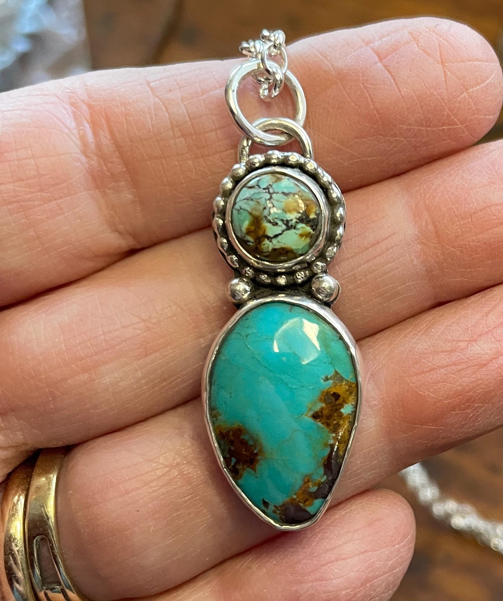 This two turquoise sterling silver pendant has shiny silver beads surrounding the smaller stone and silver balls on each side. I love the inverted teardrop shape of the larger stone and the graceful balance the smaller stone provides.