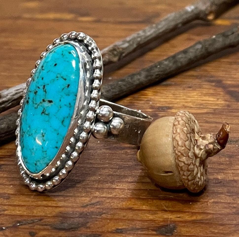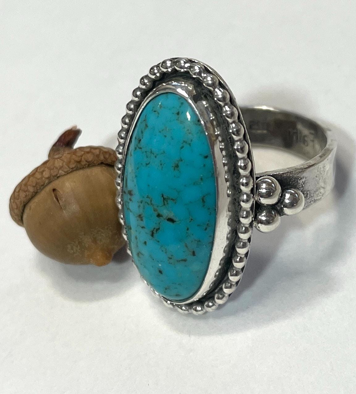 This Kingman turquoise ring has beaded silver trim, a lightly hammered band and a trio of silver balls on each side. It's entirely made from fine and sterling silver.