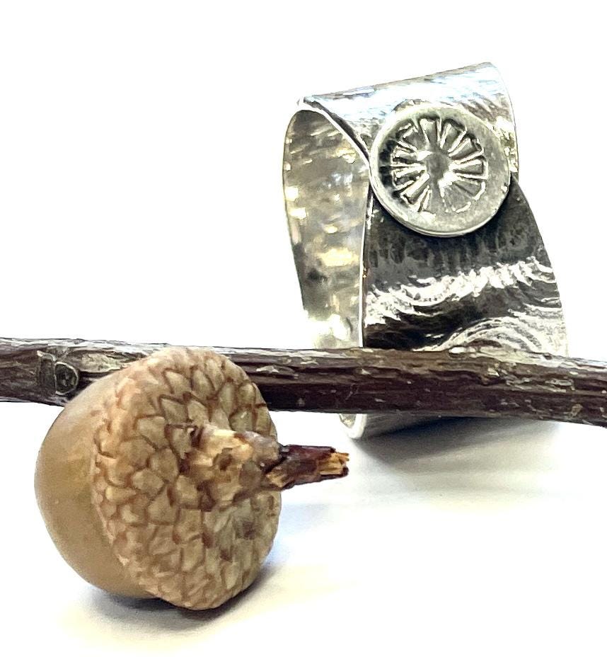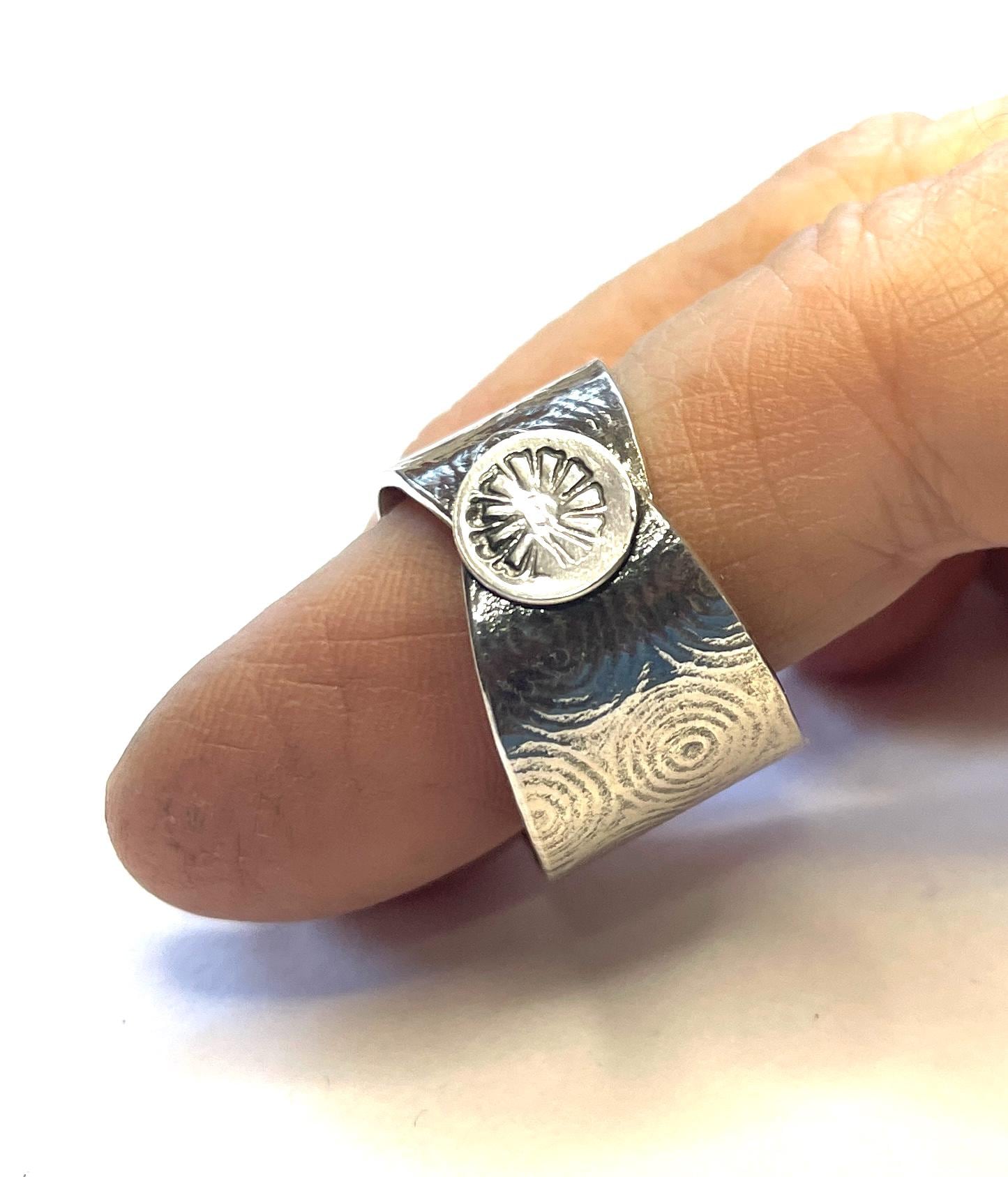 This sterling silver ring is made from melting sterling silver, rolling it into sheet and embossing a pattern on the silver. It has a stamped circle as a highlight.