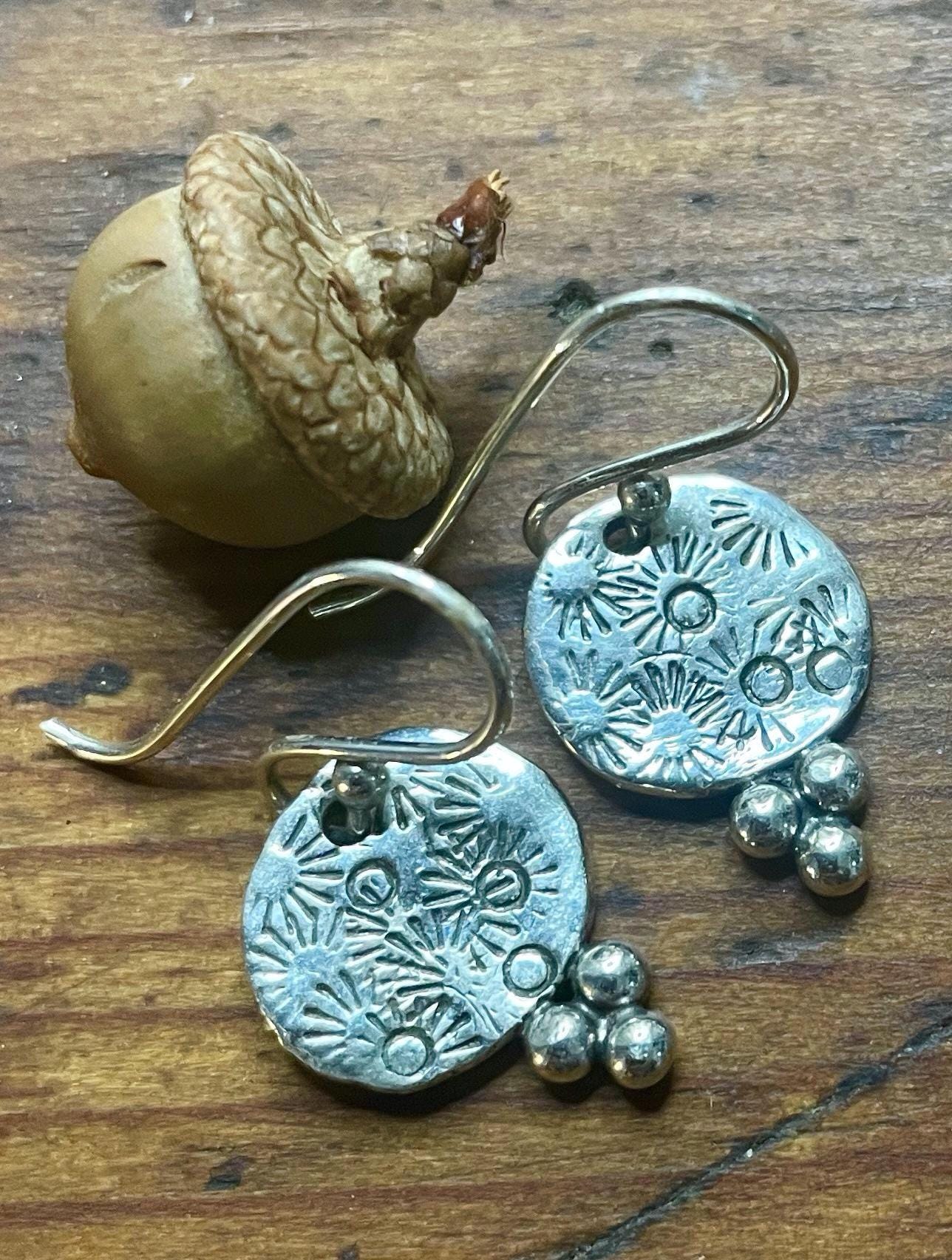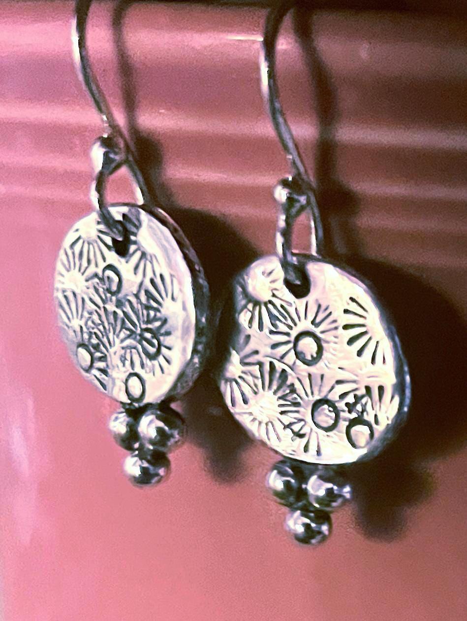 These earrings are made by melting silver and hammering it into irregular circles. The circles are stamped with a starburst pattern and a trio of shiny silver balls is added to the bottoms.