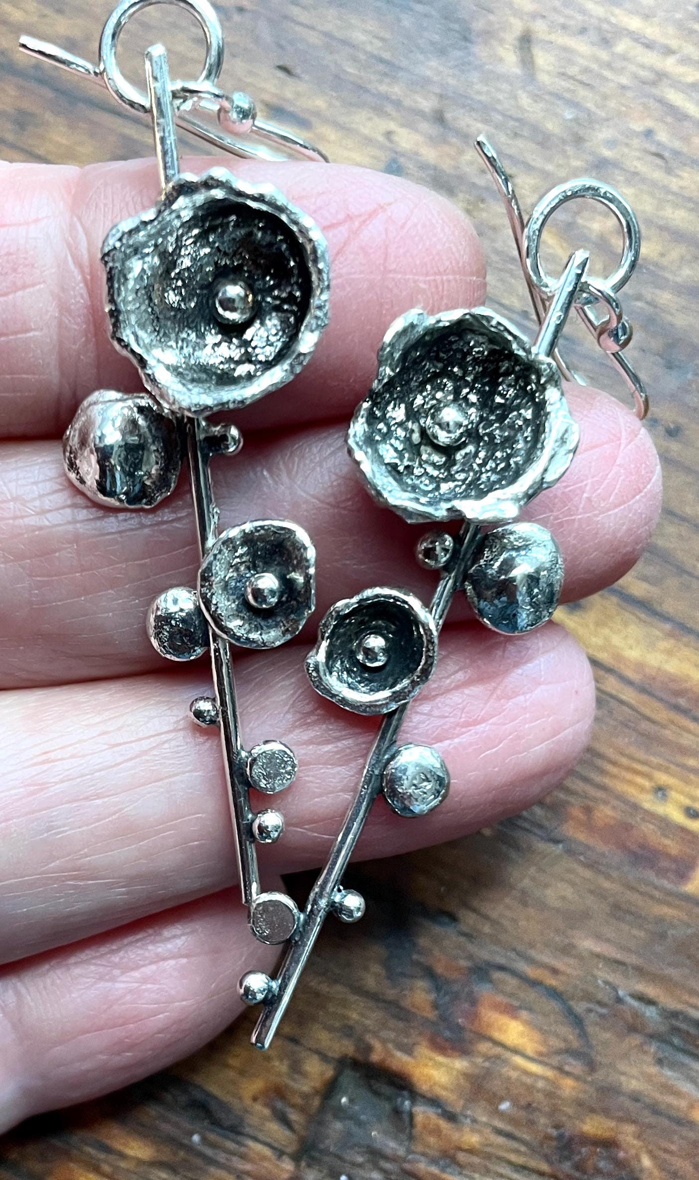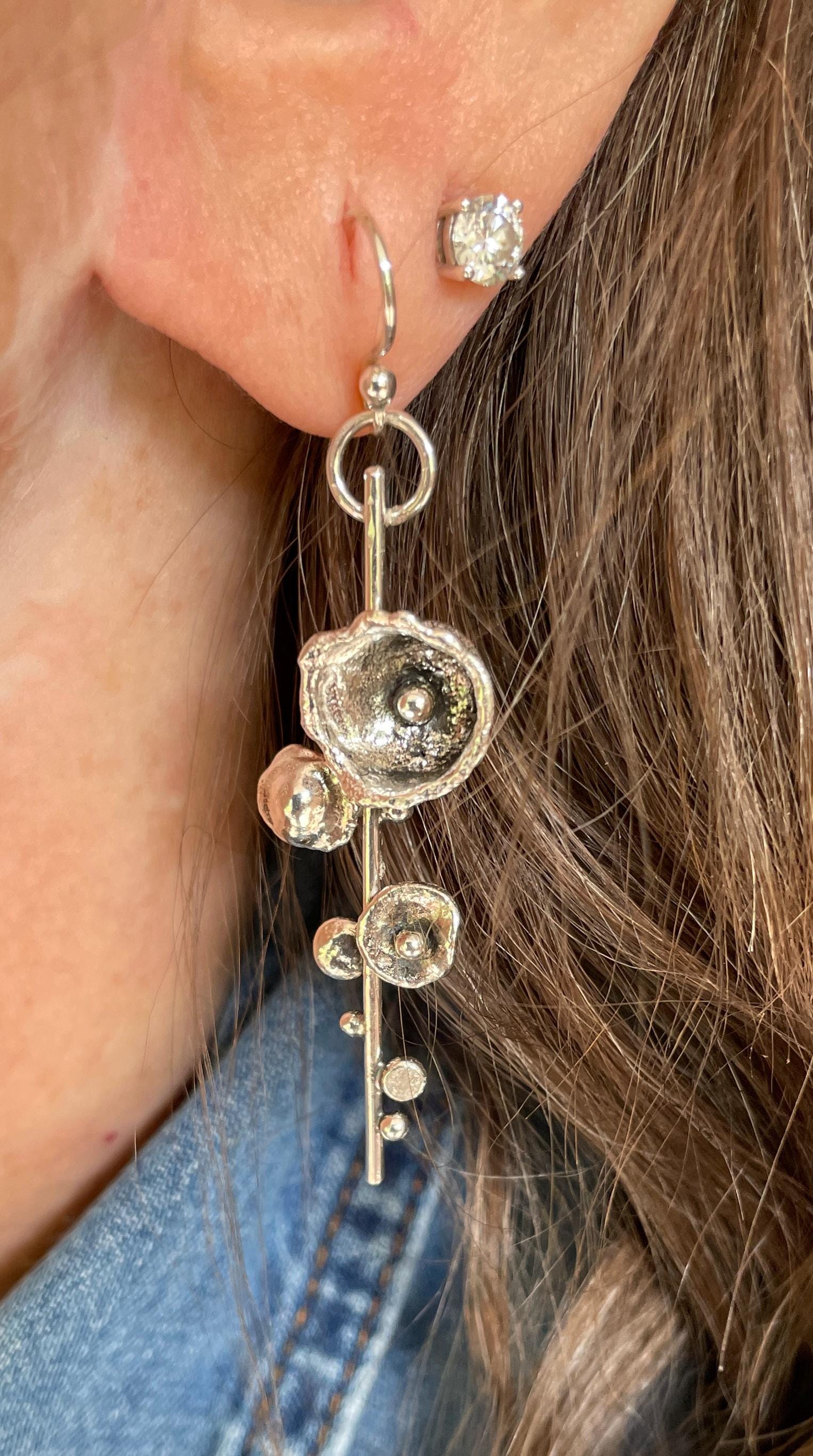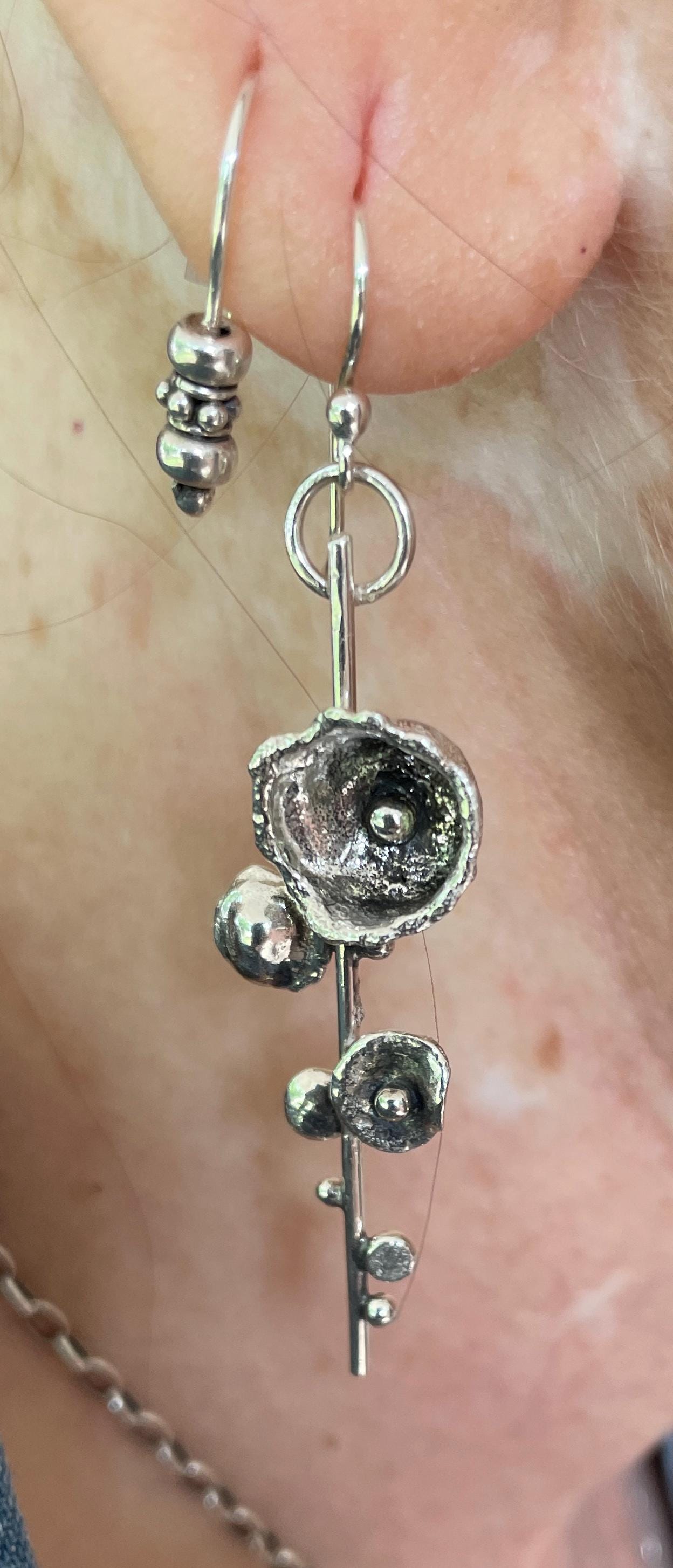 These one of a kind earrings are made from silver that has been cast by pouring molten silver into water. The results are unpredictable but can produce delicate cup shapes.