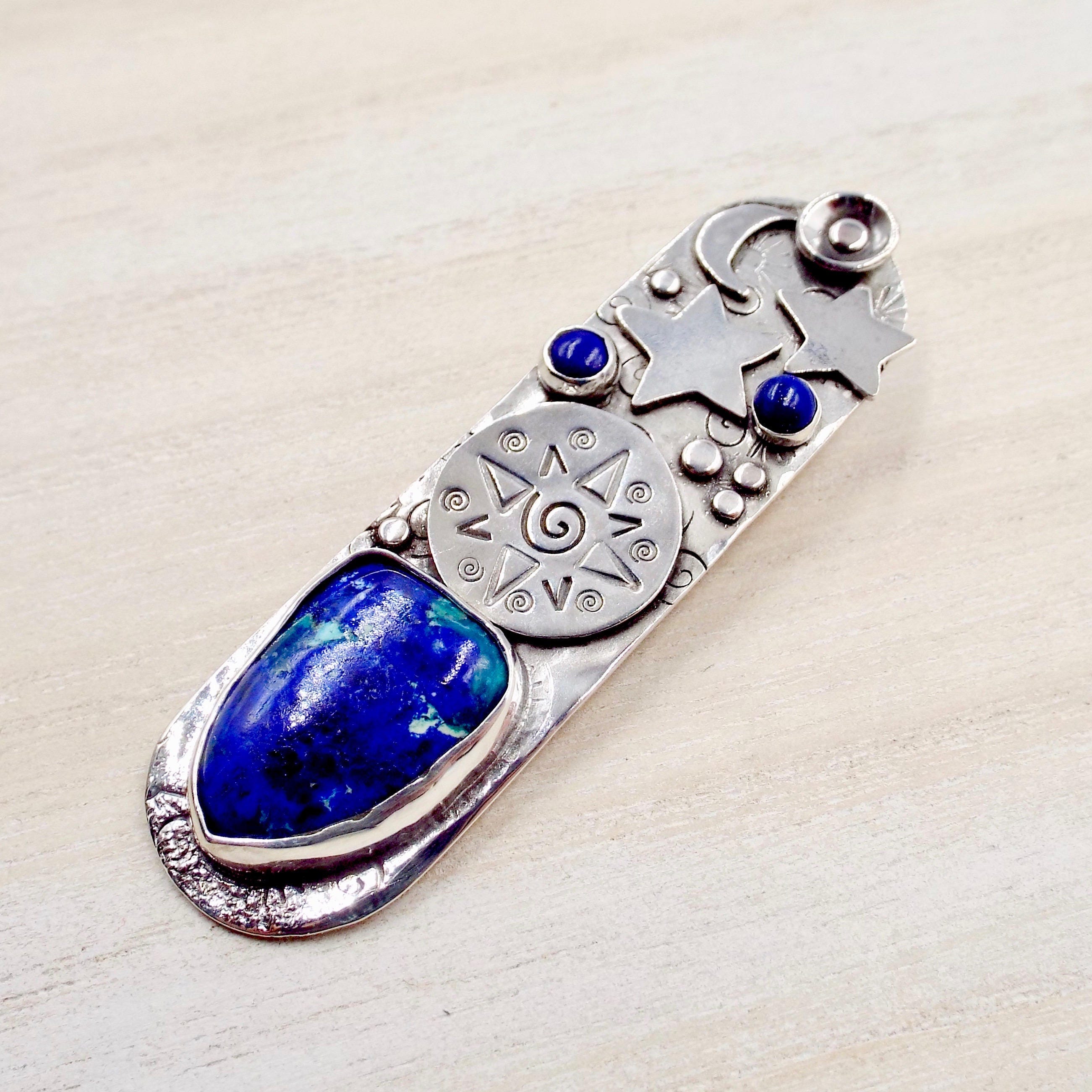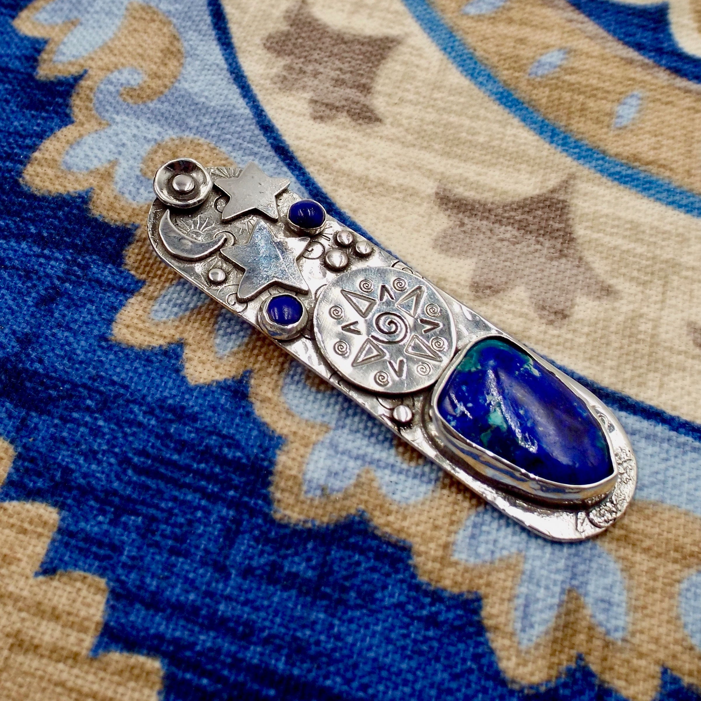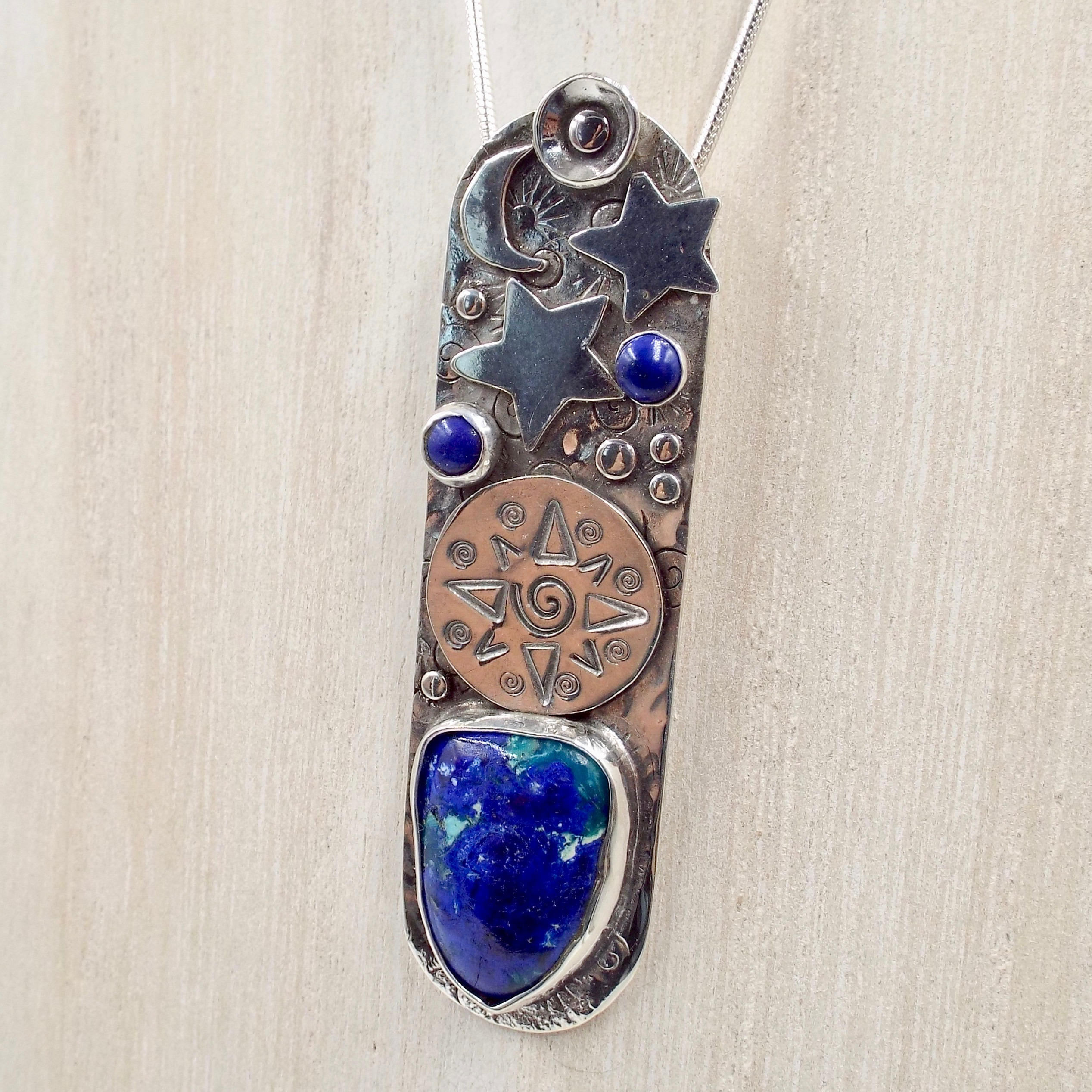 A moon and stars, dots and a circle stamped with a star surround a beautiful azurite stone with lapis accents stones on this oval sterling silver pendant.