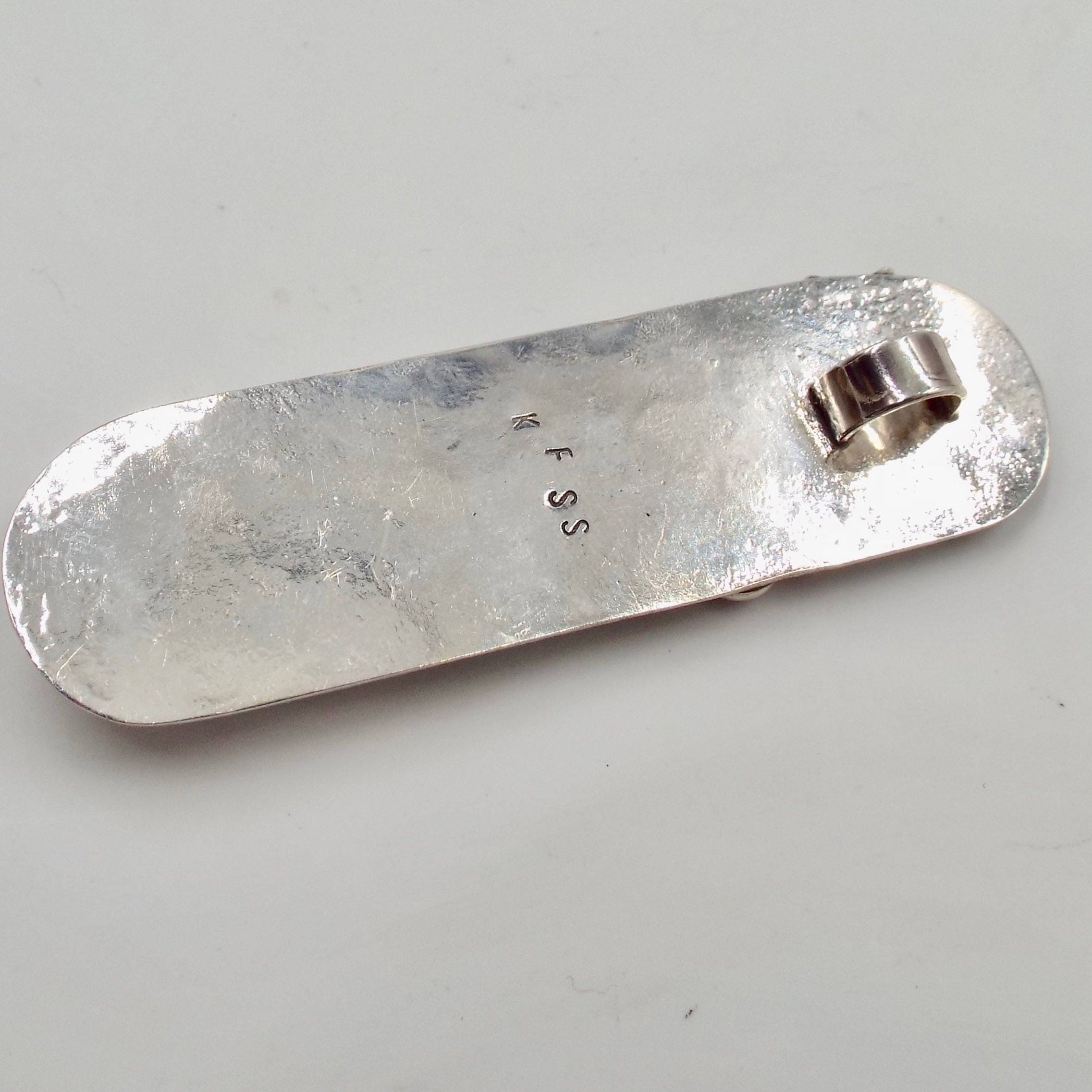 I made this pendant entirely by hand. It measures approximately 72 mm ( 2 1/2") long and 20 mm (3/4") wide