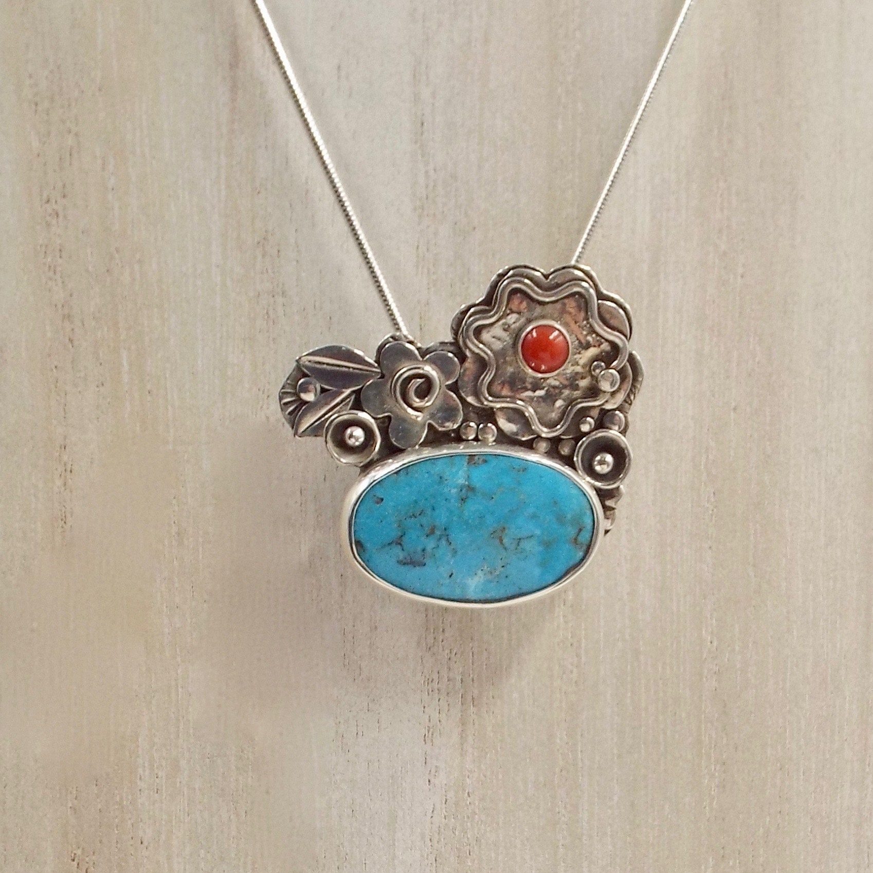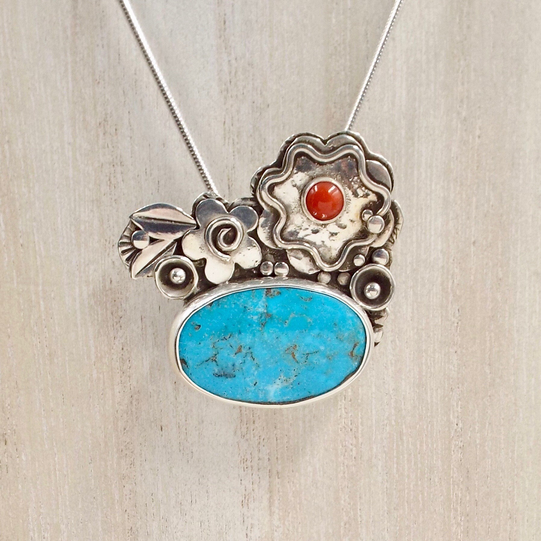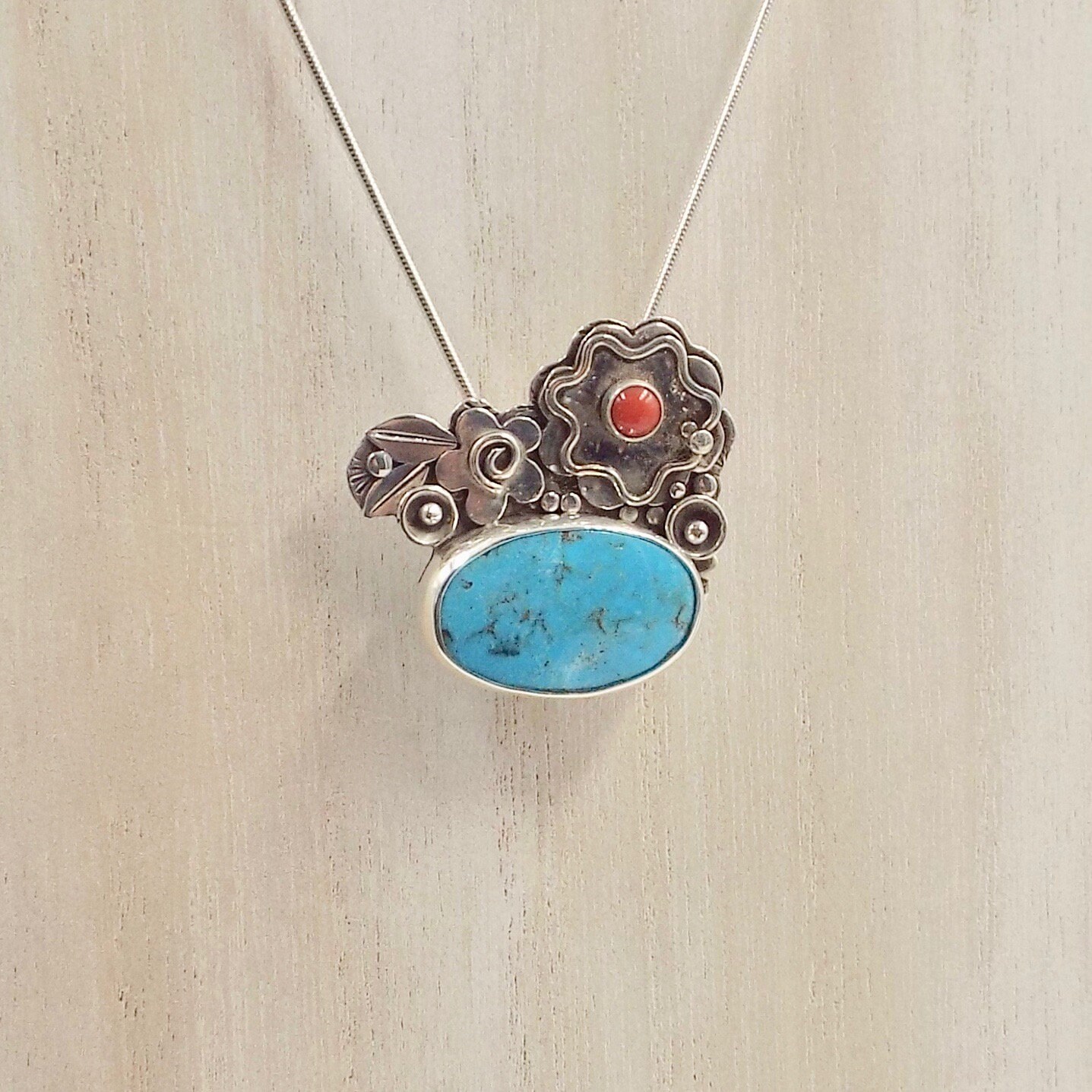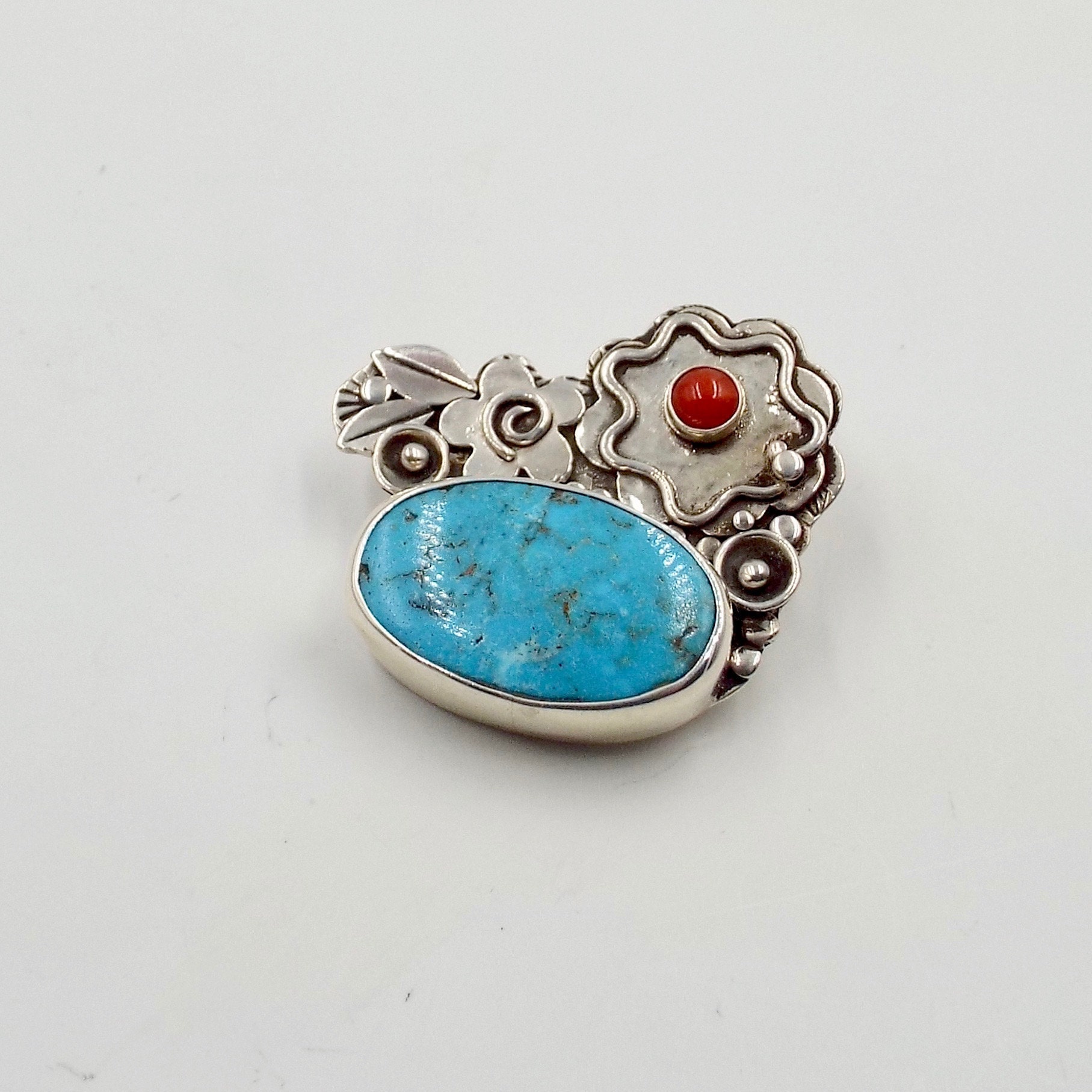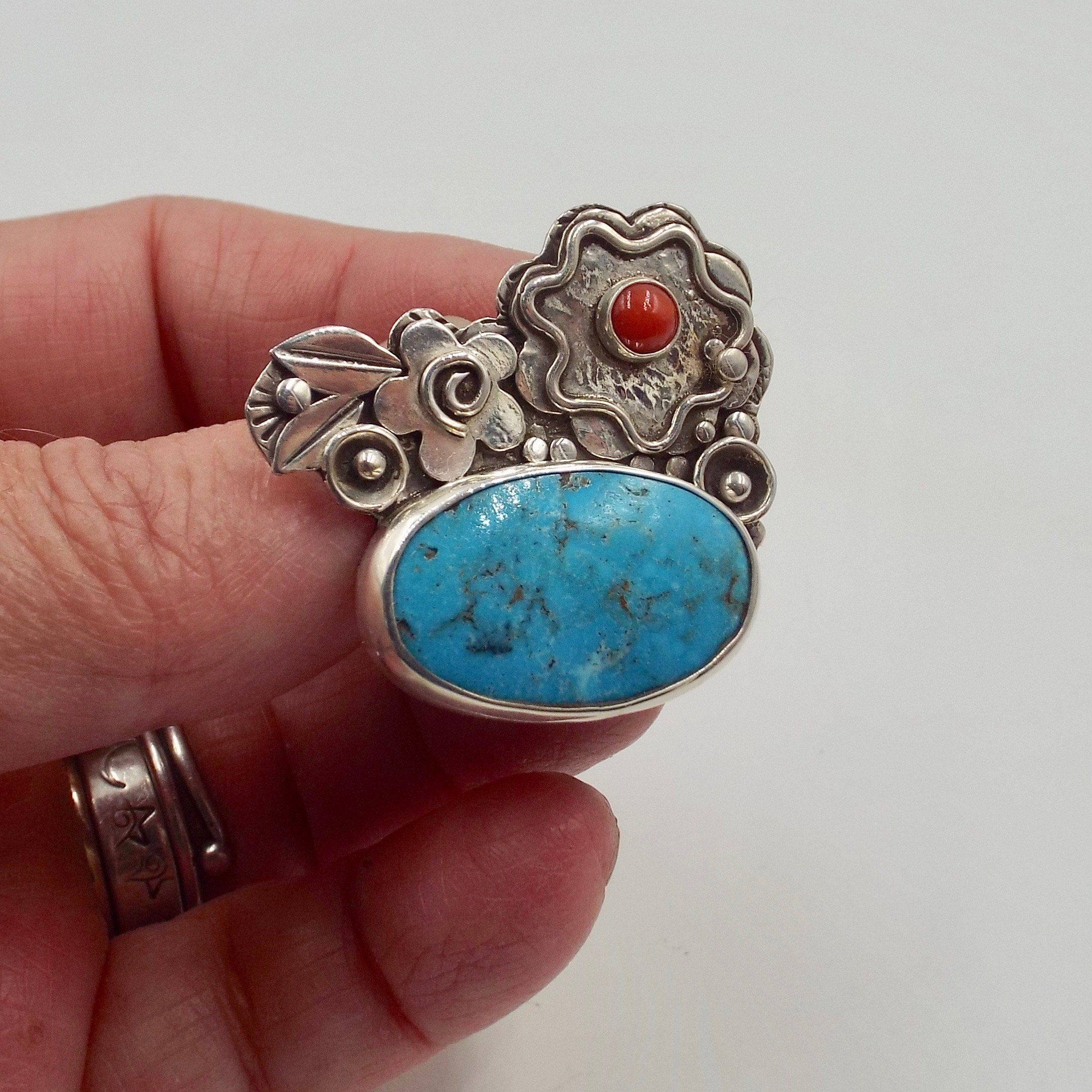 A beautiful Kingman, Arizona Turquoise gemstone is accented with a bamboo coral stone. The setting is sterling silver and features flowers and leaves.