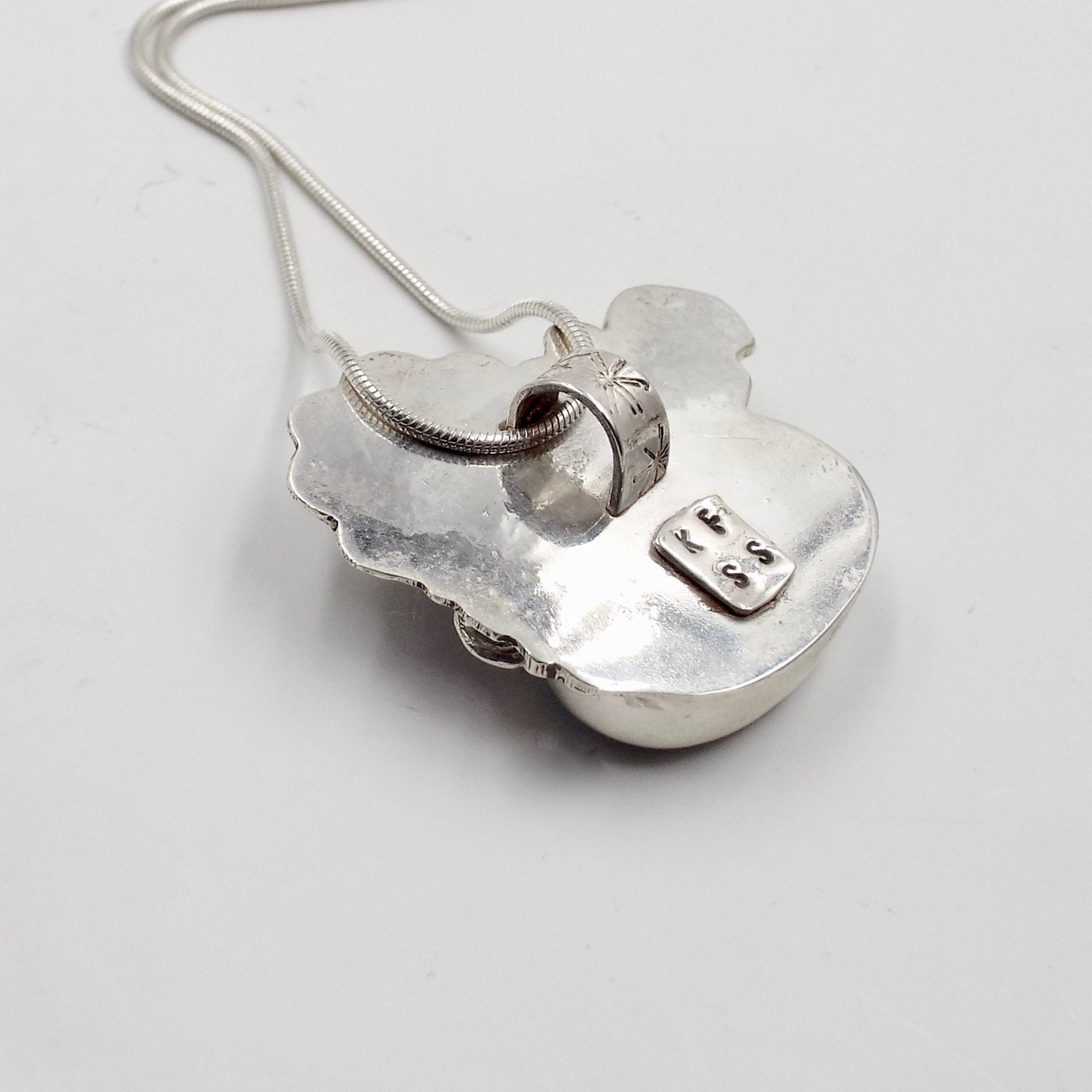 I made this pendant entirely by hand. It measures approximately 31.75 mm by 38.1 mm ( 1 1/4" h by 1 1/2").
